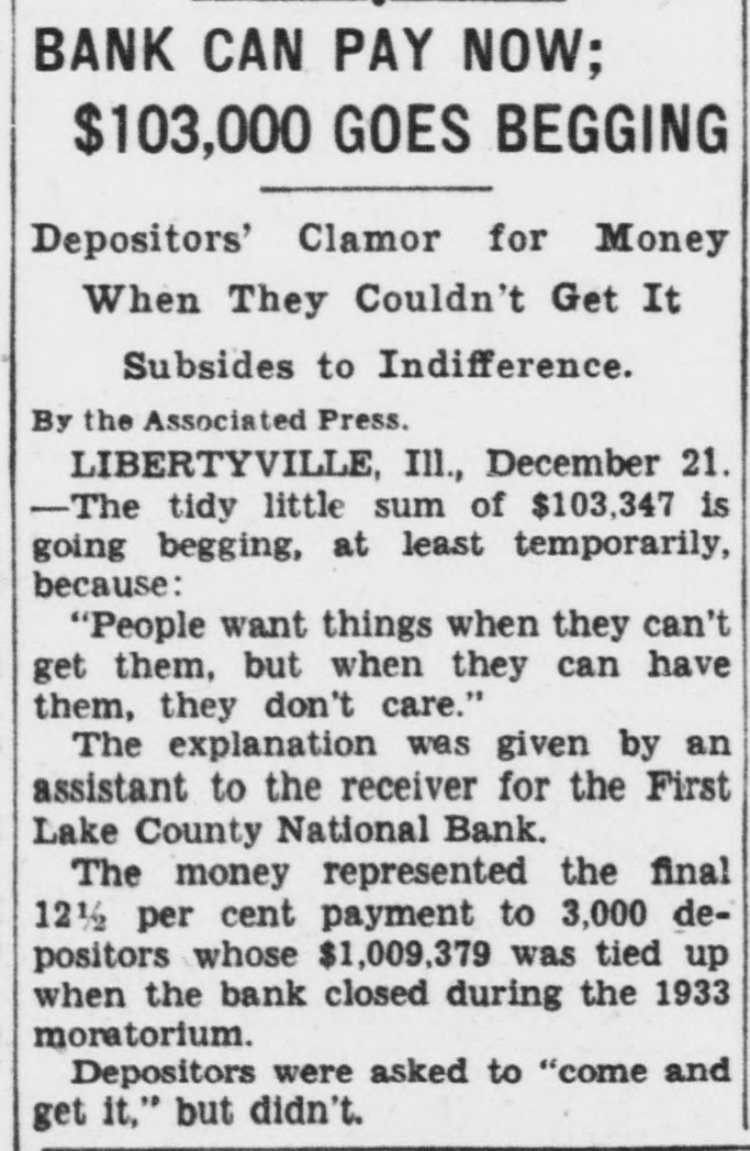 BANK CAN PAY NOW; $103,000 GOES BEGGING Depositors' Clamor for Money When They Couldn't Get It Subsides to Indifference. By the Associated Press. LIBERTYVILLE, Ill., December 21. -The tidy little sum of $103,347 is going begging, at least temporarily, because: "People want things when they can't get them, but when they can have them, they don't care." The explanation was given by an assistant to the receiver for the First Lake County National Bank. The money represented the final 12 1/2 per cent payment to 3,000 depositors whose $1,009,379 was tied up when the bank closed during the 1933 moratorium. Depositors were asked to "come and get it," but didn't.