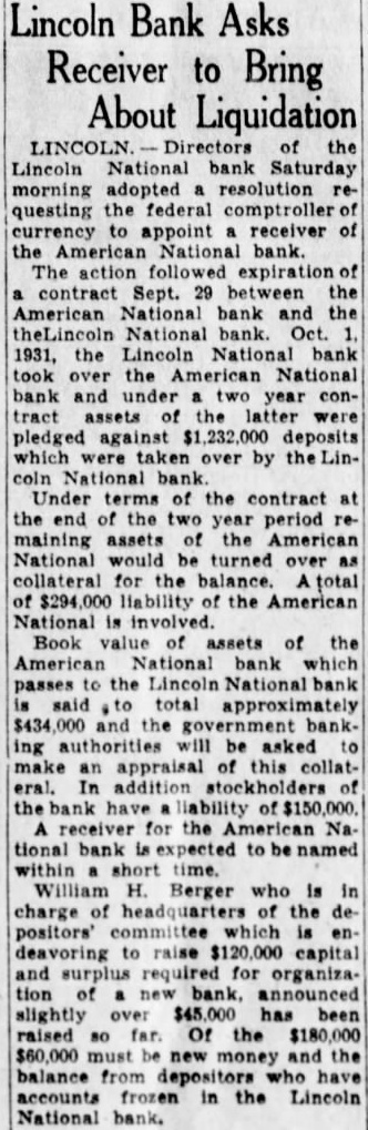 Lincoln Bank Asks Receiver to Bring About Liquidation LINCOLN Directors of the Lincoln National bank Saturday morning adopted a resolution requesting the federal comptroller of currency to appoint a receiver of the American National bank. The action followed expiration of a contract Sept. 29 between the American National bank and the theLincoln National bank. Oct. 1931, the Lincoln National bank took over the American National bank and under a two year contract assets of the latter were pledged against $1,232,000 deposits which were taken over by the Lincoin National bank. Under terms of the contract at the end of the two year period remaining assets of the American National would be turned over as collateral for the balance. total of $294,000 liability of the American National is involved. Book value of assets of the American National bank which passes to the Lincoln National bank is said to total approximately $434,000 and the government banking authorities will be asked to make an appraisal of this collateral. In addition stockholders of the bank have liability of $150,000. A receiver for the American Na. tional bank is expected to be named within short time. William H. Berger who is in charge of headquarters of the depositors' committee which is endeavoring to raise $120,000 capital and surplus required for organiza. tion of new bank, announced slightly over $45,000 has been raised so far. Of the $180,000 $60,000 must be new money and the balance from depositors who have accounts frozen in the Lincoln National bank.