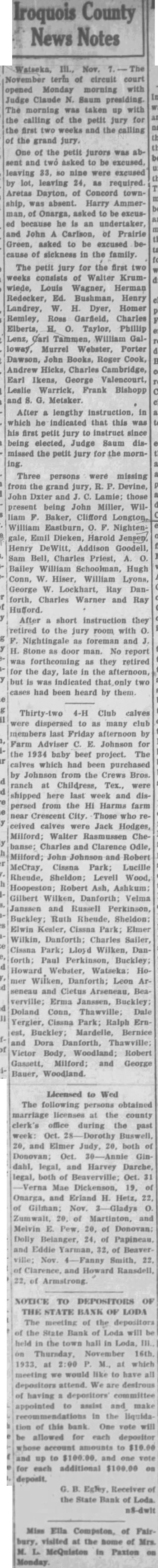 County November term circuit court opened Monday morning with Judge Claude Saum presiding. The morning was taken with calling of the petit for weeks and calling the grand jury, One of the petit jurors sent and two asked to be excused, leaving 33, nine were excused lot, leaving 24, as required. Aretas Dayton, of Concord townabsent. Harry AmmerOnarga, asked excusbecause he undertaker, John of Prairie Green, asked to be excused of sickness in the family. The petit jury for the first two consists of Walter Krumwiede, Louis Wagner, Herman Redecker, Ed. Bushman, Henry Landrey, Dyer, Homer Remley, Ross Garfield, Charles Elberts, Taylor, Phillip Carl Tammen, William loway, Murrel Webster, Porter Dawson, John Books, Roger Cook, Andrew Hicks, Charles Cambridge, Earl Ikens, George Valencourt, Leslie Warrick, Frank Bishopp Metsker. After lengthy instruction, which he indicated that this was first petit jury to instruct since being elected, Judge Saum dismissed the petit for the morning. Three persons were missing from the grand Devine, John Dxter and Lamie; those present being John Miller, William Baker, Clifford Longton, William Eastburn, Nightengale, Emil Dieken, Harold Jensen, Henry DeWitt, Addison Goodell, Sam Bell, Charles Priest, Bailey William Schoolman, Hugh Conn, Hiser, William Lyons, George Lockhart, Ray Danforth, Charles Warner and Ray Hufford. After short instruction they retired the room with Nightingale as foreman and Stone door man. No report forthcoming as they retired for the day, late in the afternoon, but was indicated two cases had been heard by them. 4-H Club calves dispersed to many club last Friday afternoon by Farm Adviser Johnson for the baby beef project. The calves which had been purchased Johnson from the Crews Bros. ranch Childress, Tex., were shipped here last week and dispersed from the Hi Harms farm near Crescent City. Those who ceived calves were Jack Hodges, Milford; Walter Rasmussen Chebanse; Charles and Clarence Odle, Milford; John Johnson and Robert McCray, Cissna Park; Lucille Rheude, Sheldon; Levell Wood, Hoopeston; Robert Ash, Ashkum; Gilbert Wilken, Danforth; Velma Janssen and Russell Perkinson, Buckley; Ruth Rheude, Sheldon: Elwin Kesler, Cissna Park; Elmer Wilkin, Danforth; Charles Sailer, Cissna Park; Lloyd Wilken, forth; Paul Perkinson, Buckley; Howard Webster, Watseka: mer Wilken, Danforth; Leon seneau and Cletus Arseneau, verville; Erma Janssen, Buckley; Doland Conn, Thawville; Dale Yergler, Cissna Park; Ralph est, Buckley; Mardelle, Bernice and Dora Danforth, Victor Body, Woodland; Robert Gassett, Milford; and George Bauer, Woodland. Licensed to Wed The following obtained marriage licenses the county office during the past Oct. Buswell, and Elmer Judy, 20, both Oct. Ginlegal, and Harvey Darche, both Beaverville; Oct. Mae Dickenson, and Erland H. Nov. Zumwalt. of Martinton, Melvin Pew, 20, of Donovan: Dolly Belanger, 24, of Papineau, Eddie Yarman, Beaverand Howard Ransdell, 22, Armstrong. NOTICE TO DEPOSITORS OF BANK OF LODA meeting the the Bank Loda will the Loda, Thursday, November 16th. at which meeting would like have depositors attend. are appointed assist and the liquidathis bank. One vote will allowed for each depositor amounts and each additional deposit. Egley Receiver State Bank of Loda. n8-dwit Ella Fairvisited the Mrs. McQuiston Paxton Monday.