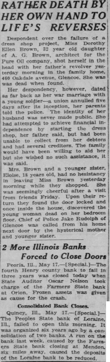 RATHER DEATH BY HER OWN HAND TO LIFE'S REVERSES Despondent over the failure of dress shop project, Miss Dorothy Ellen Brown, 32 year old daughter of A. G. Brown, architect for the Pure Oil company, shot herself in the head with her father's revolver yes. morning in the family home, 460 Oakdale Glencoe. She was was dead when found. Her despondency however, dated as far back as her war marriage with young soldier- union annulled five days after its inception, her parents told the police. The identity of her husband was never made public. She had attempted to achieve financial independence by starting the dress shop, her father said, but had been unable to collect from her debtors and had several creditors. The family would have been willing to aid her but she wished no such assistance, it was said. Mrs. Brown and a younger sister, Eloise, 18 years old, had no hesistancy in leaving Miss Brown yesterday morning while they shopped. She was seemingly cheerful after visit from friends Friday. Upon their return they found the door locked and once inside the house, discovered the young woman dead on her bedroom floor. Chief of Police Jake Rudolph of Glencoe was called from his home next door by the hysterical mother and younger sister 2 More Illinois Banks Forced to Close Doors fourth Henry county bank to fail in three years was closed today when State Auditor Oscar Nelson took charge of the Farmers State bank at Orion. Frozen assets was given as cause for the crash. Consolidated Bank Closes. Quincy, III., May 17.-[Special.]The Peoples State bank of Loraine, III., failed to open this morning. It was organized six years ago by a consolidation of two banks. A run on the bank last week, caused by the Farmers State bank closing at Mendon, six miles away caused the deposits of the Loraine bank to be reduced.