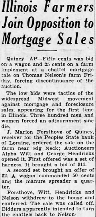 Illinois Join Opposition Mortgage cents bid and cents farm chattel mortgage Thomas Nelson's farm forcing discontinuance of the auction. The low bids were tactics of the widespread Midwest movement against mortgage and foreclosure sales, appearing for the first time Illinois. Three hundred men and women forced adjournment Marion Forsthove of Quincy, receiver Peoples State bank Loraine, ordered the sale on the farm near Big Neck; Auctioneers Alpha Witt and George Hendricks opened First set harness. brought bid of $11. second set brought offer wagon commanded 50 cents the manure spreader quar- Forsthove, Witt, Hendricks Nelson withdrew the house conferred. The was called Bidders apparently intended to the chattels back to Nelson.