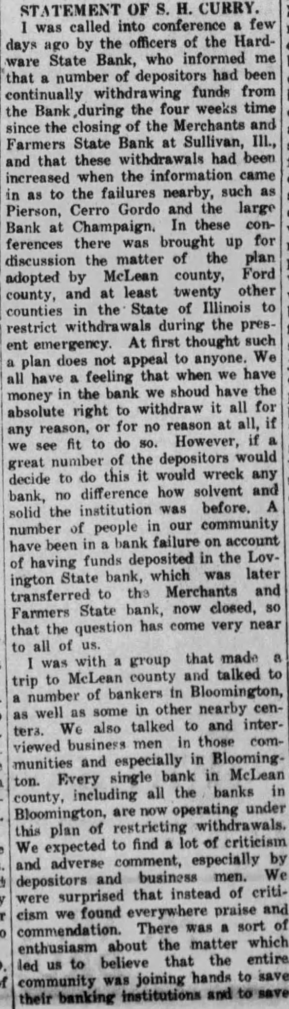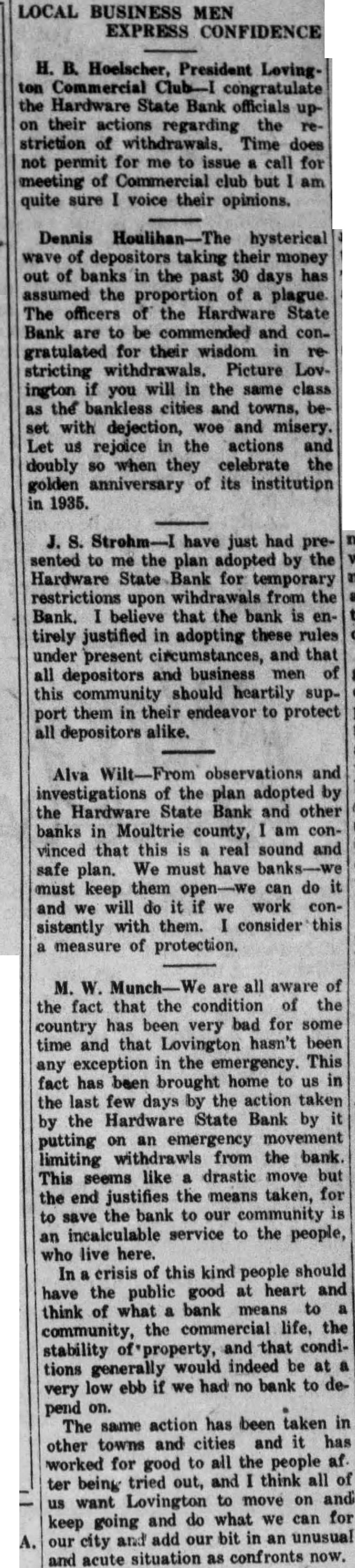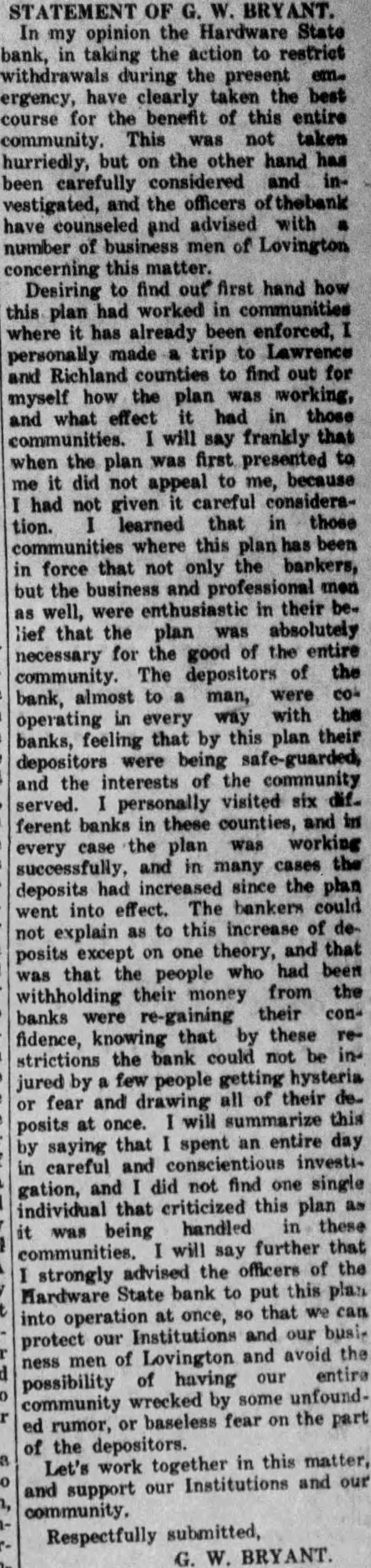 Let's Help Our Bank Save Lovington From a Financial Crash The Lovington Reporter joins the scores of Lovington business men and citizens in commending the officials of the Hardware State Bank in their decision Tuesday to take stitch in time" and save Lovington from a financial crash, which would have reached every home in the community and from which it would require years to recover. Elsewhere in this issue appears the bank's statement over its signature, outlining in detail its plan to limit withdrawals from the bank. As soon as conditions improve sufficiently to warrant it. the regular privileges will be restored to depositors, and it is hoped, by all of us, that this improvement will soon come. The Hardware State B. nk is sound, always has been sound, and will always remain so as long as this community keeps its head and refuses to allow fear to take the place of sober judgment. But the greatest bank strength conceivable is clay in the hands of public fear. No bank can completely liquidate its resources in full. Common sense tells us that no bank stores its deposits away vault to await their withdrawals by depositors. If a bank couldn't loan— and keep large percent of its deposits, it could not long exist as bank. How many borrowers from a bank walk up to the teller's window and meet their obligations in full on the day that their notes come Ask your banker. He'll tell you that very few can do this. The banker in most cases simply accepts what you can pay, and either renews the note or grants an extension. Neither can the banker pay his of a moment's notice. He must have reasonable time, for only a certain percent of his assets are liquid. Every individual who loses faith and runs to the bank to get his money thinks, as rule, that he is the only one, or only one of a few. But his action soon becomes known and when enough depositors get the same idea it results in run on the bank and then the damage is done. Meanwhile, the money taken from the banks because of such fear, has been removed from circulation and the interests of every one accordingly affected. To go now to your bank and demand your money is simply a breach of faith with this community and with yourself, an act of shortsighted selfishness, which will only delay the hour when the bank can remove its precautionary restrictions. Two days after the Hardware State Bank started its withdrawal restrictions, the other banks of the county got together and adopted similar measures. Never since these hysterical times have beset us has the necessity of standing by our bank been SO important. We're all certain for disaster and ruin if we fail to use our heads. Our advice is, co-operate with the Hardware State Bank in this timely effort to save our community from a financial wreck that it has never known goodness knows, none of us can afford to experience it.