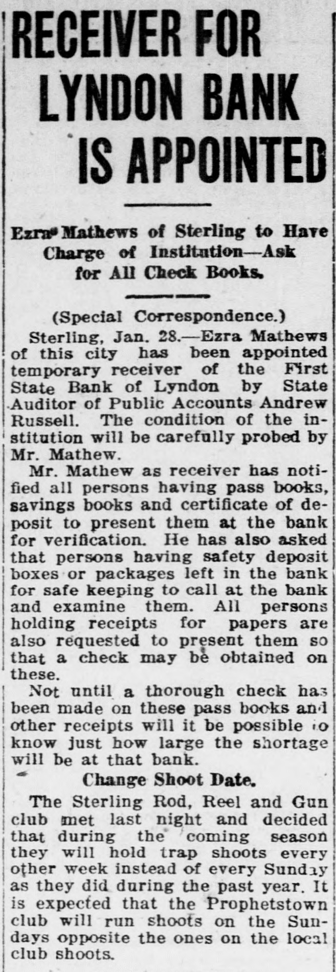 RECEIVER FOR LYNDON BANK IS APPOINTED Ezra Mathews of Sterling to Have Charge of Institution-Ask for All Check Books. (Special Correspondence.) Sterling, Jan. 28.-Ezra Mathews of this city has been appointed temporary receiver of the First State Bank of Lyndon by State Auditor of Public Accounts Andrew Russell. The condition of the institution will be carefully probed by Mr. Mathew. Mr. Mathew as receiver has notified all persons having pass books, savings books and certificate of deposit to present them at the bank for verification. He has also asked that persons having safety deposit boxes or packages left in the bank for safe keeping to call at the bank and examine them. All persons holding receipts for papers are also requested to present them so that a check may be obtained on these. Not until a thorough check has been made on these pass books and other receipts will it be possible io know just how large the shortage will be at that bank. s Change Shoot Date. The Sterling Rod, Reel and Gun club met last night and decided that during the coming season they will hold trap shoots every other week instead of every Sunday as they did during the past year. It is expected that the Prophetstown club will run shoots on the Sundays opposite the ones on the local club shoots.