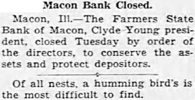 Macon Bank Closed. Macon, Ill.-The Farmers State Bank of Macon, Clyde Young president. closed Tuesday by order of the directors, to conserve the assets and protect depositors. Of all nests, a humming bird's is the most difficult to find.