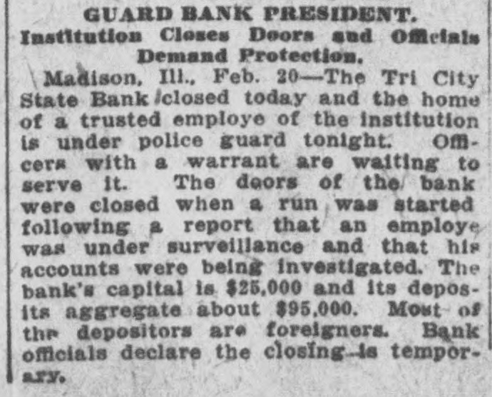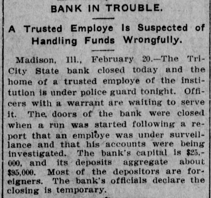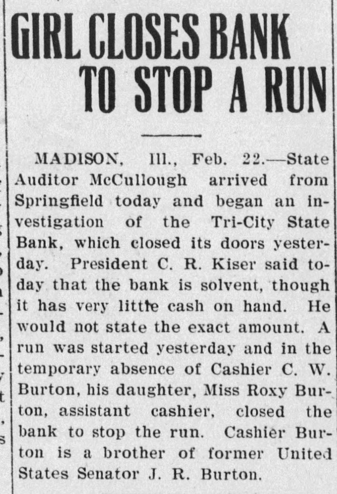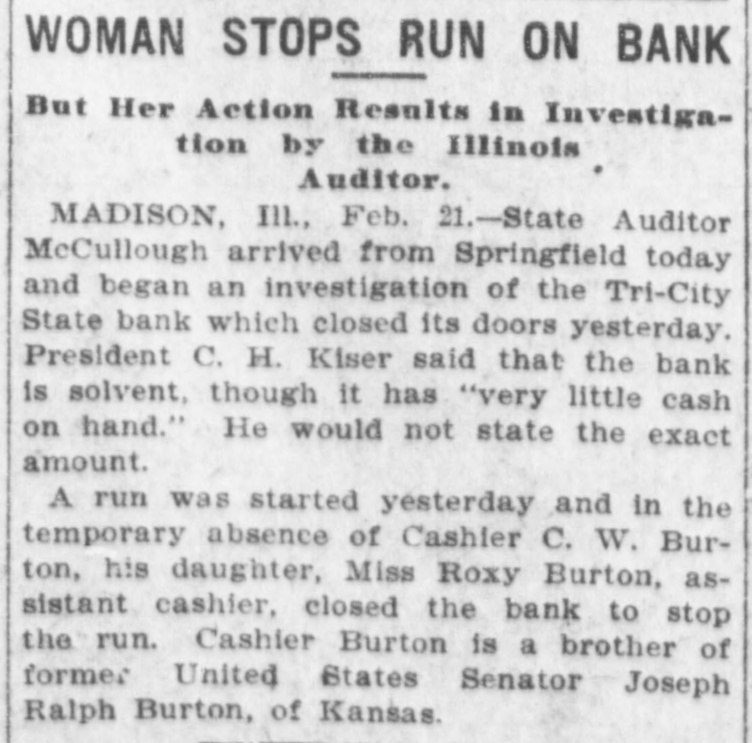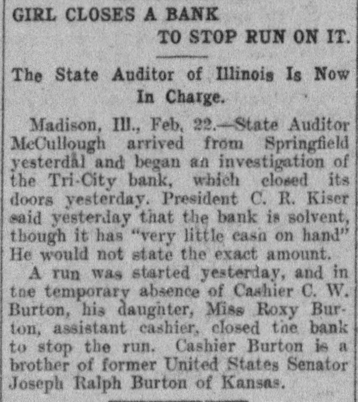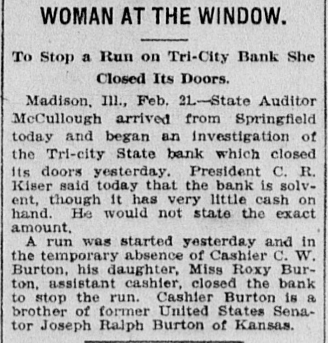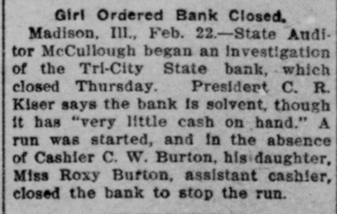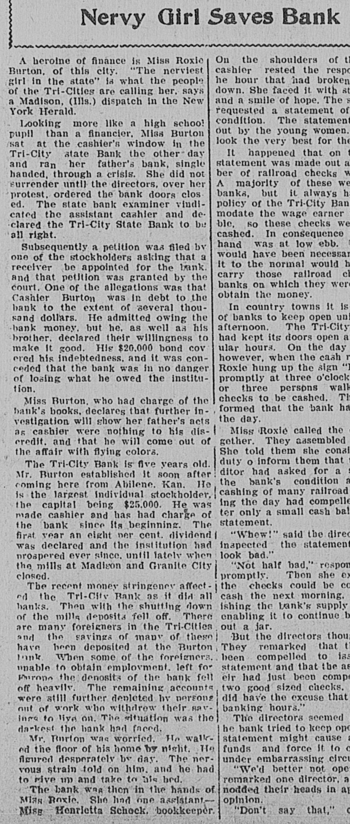 Nervy Girl Saves Bank On the shoulders of tl A heroine of finance is Miss Roxie cashier rested the respo Burton, of this city. "The nerviest he hour that had broken girl in the state" is what the people down. She faced it. with st of the Tri-Cities are calling her, says and a smile of hope. The S a Madison, (IIIs.) dispatch in the New requested a statement of York Herald. condition. The statement Looking more like a high school out by the young women. pupil than a financier, Miss Burton look the very best for the /sat at the cashier's window in the It happened that on t Tri-City state Bank the other day statement was made out a and ran her father's bank, single ber of railroad checks W handed, through a crisis. She did not A majority of these we surrender until the directors, over her banks, but it always h protest, ordered the bank doors clos. ed. The state bank examiner vindipolicy of the Tri-City Ban modate the wage earner cated the assistant cashier and deble, So these checks we clared the Tri-City State Bank to be cashed. In consequence all right. hand was at low ebb. in Subsequently a petition was filed by would have been necessar one of the stockholders asking that a it to the normal would h receiver be appointed for the bank. carry those railroad el and that petition was granted by the banks on which they were court. One of the allegations was that obtain the money. Cashier Burton was in debt to the bank to the extent of several thouIn country towns It is of banks to keep open uni sand dollars. He admitted owing the afternoon. The Tri-City bank money. but he, as well as his had kept its doors open a brother. declared their willingness to ular hours. On the day make It good. His $20,000 bond COV however, when the cash r cred his indebtedness. and it was conRoxie hung up the sign ") ceded that the bank was in no danger promptly at three o'clock of losing what he owed the institution. or three persons walk checks to be cashed. Th Miss Burton, who had charge of the formed that the bank ha bank's books, declares that further inthe day. vestigation will show her father's acts Miss Roxie called the as cashier were nothing to his discredit. and that he will come out of gether. They assembled She told them she consi the affair with flying colors. duty o inform them that 1 The Tri-City Bank is five years old. ditor had asked for a = Mr. Burton established it soon after the bank's condition à coming here from Abilene. Kan. He cashing of many railroad is the largest Individual stockholder, ing the day had compelle the capital being $25,000. He was ter only a small cash bal made cashier and has had charge of statement. the bank since Its beginning. The "Whew!" said the direc first year an eight per cent. dividend was declared and the institution had inspected the statement look bad." prospered ever since. until lately when "Not half bad," respon the mills at Madison and Granite City closed. promptly. Thon she ex the checks could be co The recent money stringency affectcash the next morning. od the Tri-Citv Bank as it did all ishing the bank's supply banks. Then with the shutting down of the mills deposits fell off. There enabling it to continue b out a jar. are many foreigners in the Tri-Cities But the directors thou and the savings of many of these have been deposited at the Burton They remarked that t lank When some of the foreigners. been compelled to iss statement and that the as unable to obtain employment. left for eir had just been compo Purope the denosits of the bank fell off heavily. The remaining accounts two good sized checks. did have the excuse that were still further depleted hv persons out of work who withdrew their savbanking hours." The directors seemed ings to live on. The situation was the darkest the bank had faced. he bank tried to keep ope statement might cause a Mr. Burton was worried. He walkfunds and force It to c ed the floor of his home by night. He figured desperately by day. The nerunder embarrassing circu "We'd better not oper vous strain told on him. and he had remarked one director, a to give m and take to bis bed. The bank was then in the hands of nodded their heads in an Miss Roxie. She lind one assistantopinion. "Don't say that," o Miss Henrletta Schock. bookkeeper.