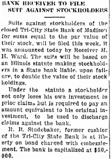 BANK RECEIVER TO FILE SUIT AGAINST STOCKHOLDERS Suits against stockholders of the closed Tri-City State Bank of Madison for sums equal to the par value of their stock, will be filed this week, it was announted today by Receiver M. II. Ward. The suits will be based on an Illinois statute making stockholders in a State bank liable. upon failure, to double the value of their stock holdings. Under the statuto a stockholder not only loses his own investment to prior claim. but Is required to pay an amount equivalent to his original investment, to be used to discharge claims against the bank. R. B. Studebaker, former cashier of the Tri-City State Bank Is at 11berty on bond charged with embezzlement. The bank Is capitalized at $50,000.