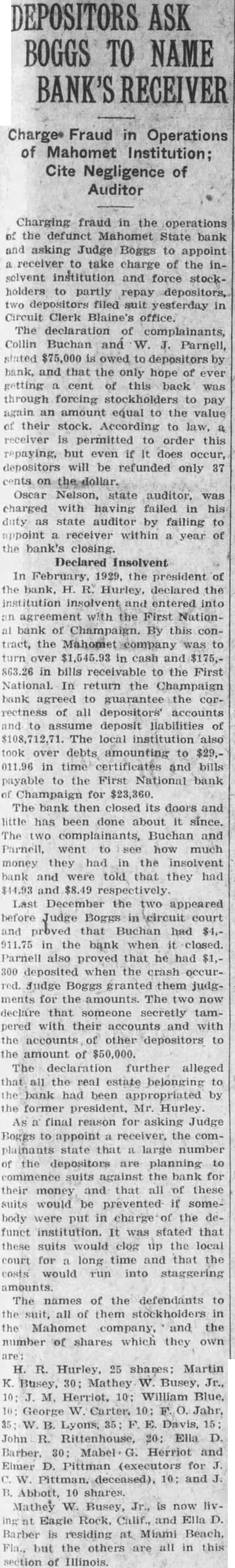 DEPOSITORS ASK BOGGS TO NAME BANK'S RECEIVER Charge® Fraud in Operations of Mahomet Institution; Cite Negligence of Auditor Charging fraud in the operations of the defunct Mahomet State bank and asking Judge Boggs to appoint a receiver to take charge of the insolvent institution and force stockholders to partly repay depositors, two depositors filed suit yesterday in Circuit Clerk Blaine's office. The declaration of complainants, Collin Buchan and W. J. Parnell, stated $75,000 is owed to depositors by bank, and that the only hope of ever getting a cent of this back was through forcing stockholders to pay again an amount equal to the value of their stock. According to law, a receiver is permitted to order this repaying, but even if It does occur, depositors will be refunded only 37 cents the dollar. Oscar Nelson, state auditor, was charged with having failed in his duty as state auditor by failing to appoint a receiver within a year of the bank's closing. Declared Insolvent In February. 1929, the president of the bank, H. R. Hurley, declared the institution insolvent and entered into an agreement with the First Nationat bank of Champaign. By this contract, the Mahomet company was to turn over $1,545.93 in cash and $175,863.26 in bills receivable to the First National. In return the Champaign bank agreed to guarantee the correctness of all depositors' accounts and to assume deposit liabilities of $108,712.71. The local institution also took over debts amounting to $29,011.96 in time certificates and bills payable to the First National bank of Champaign for $23,360. The bank then closed its doors and little has been done about it since. The two complainants, Buchan and Parnell, went to see how much money they had in the insolvent bank and were told that they had $14.93 and $8.49 respectively Last December the two appeared before Judge Boggs in circuit court and proved that Buchan had $4,911.75 in the bank when it closed. Parnell also proved that he had $1,300 deposited when the crash occurred. Judge Boggs granted them judgments for the amounts. The two now declare that someone secretly tampered with their accounts and with the accounts of other depositors to the amount of $50,000. The declaration further alleged that all the real estate belonging to the bank had been appropriated by the former president, Mr. Hurley. As a final reason for asking Judge Boggs to appoint receiver, the complainants state that a large number of the depositors are planning to commence suits against the bank for their money and that all of these suits would be prevented if somebody were put in charge of the defunct institution. It was stated that these suits would clog up the local court for a long time and that the costs would run into staggering amounts. The names of the defendants to the suit, all of them stockholders in the Mahomet company, and the number of shares which they own are: H. R. Hurley, 25 shares; Martin K. Busey, 30; Mathey W. Busey, Jr., 10: M. Herriot, 10: William Blue, 10: George W. Carter. 10: F. O. Jahr, 35 W. B. Lyons, 35: F. E. Davis, 15: John R. Rittenhouse, 20: Ella D. Barber, 30; Mabel G. Herriot and Elmer D. Pittman (executors for J. C. W. Pittman, deceased), 10; and J. B. Abbott, 10 shares. Mathey W. Busey, Jr., is now living at Eagle Rock, Calif., and Ella D. Barber is residing at Miami Beach, Fla., but the others are all in this section of Illinois.