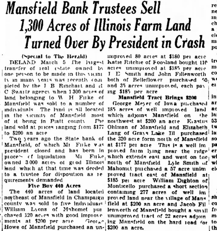 Mansfield Bank Trustees Sell 1,300 Acres of Illinois Farm Land Turned Over By President in Crash (Special to The Herald) DELAND March The of real estate owned by one person to be made this in many years recently pleted by the and when of land belonging to W H of Mansfield sold to number of The all located the of Mansfield most of being Piatt county The land sold at prices from $177 to $200 an Two years ago the State bank of of which president closed and has been in liquidation owned of od Illinois land which at that time deeded to a trustee for disposition as quirements Five Buy 440 Acres The 440 acres land located northeast of Mansfield In Champaign county was sold to William of Mahomet pur chased 120 with good improve ments at $200 per Howe of Mansfield purchased an improved 80 at $180 per Ritchie of Foosland bought 110 unimproved at $185 per Smith and John Fillenworth both of Belleflower purchased is and 35 acres unimproved, each $185 acre Manafield Tract Brings $200 George Meyer of Iowa purchased 185 of land which adjoins Mansfield on $200 an acte Ohiman of Mansfield and Elizabeth Lang Grays Lake purchased the acie form north of Mansfield at $177 per This well Im proved lying near the ridge which extends and west the on north of Mansfield Lyle Smith of Mahomet 57 acre unim proved tract east of Mansfield $185 per acre William Dighton of Monticello purchased short section containing 277 acres of well Im land near the village of Mans field at $200 an acre and Jacob Fill lenworth of Manafield bought unimproved tract of 22 adjoin ing Mansfield on the hard to $200 an the