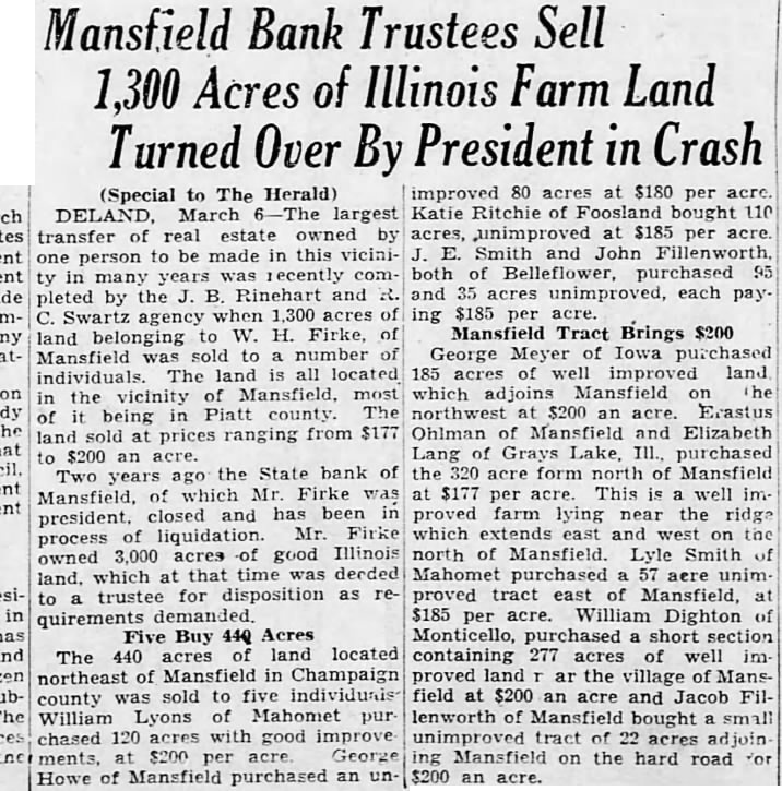 Bank Trustees Sell Acres of Illinois Farm Land Turned Over By President in Crash (Special The Herald) March largest transfer real estate owned one to be made in this viciniperson many years pleted by the Rinehart and agency when land belonging to H. Mansfield sold number individuals. The land all located vicinity most the being county. land prices ranging from $200 an the State bank of Two which Mr. Firke Mansfield, closed and has been president. Mr. Firke of liquidation. process 3,000 good Illinois owned which at that time decded trustee for disposition as to quirements Five Buy Acres The acres located northeast of Mansfield in Champaign was sold to five individuals county William Lyons of Mahomet chased 120 acres with good improve ments, $200 per George Howe of Mansfield purchased an improved 80 $180 per Katie Ritchie of Foosland bought at $185 per acre. Smith and John both of Belleflower, purchased and 35 unimproved, each $185 Mansfield Tract Brings $200 George Meyer Iowa purchased 185 of improved land which adjoins Mansfield northwest $200 Erastus Ohlman of Mansfield and Elizabeth Lang Lake, purchased the form north of Mansfield at $177 per acre. This well improved farm lying near the ridge which extends and the Mansfield. Lyle Smith Mahomet purchased proved tract east of Mansfield, $185 William Dighton Monticello, purchased short section containing 277 well improved land ar the village of field $200 an acre and Jacob lenworth of Mansfield bought unimproved tract adjoin Mansfield on the hard road an acre.