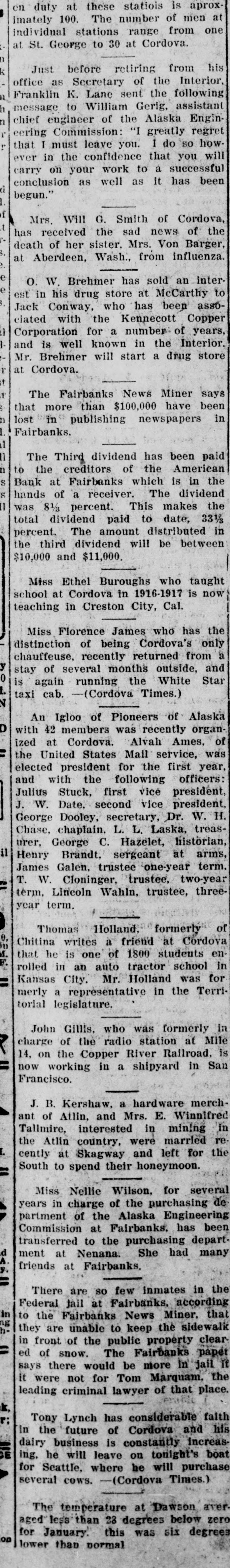 duty at these statiois is aprox- at 100. The number stations range imately en individual of from men one at St. George to 30 at Cordova. Just before retiring from his office as Secretary of the Interior, Franklin K. Lane sent the following to William Gerig, assistant of the chief message engineer Alaska Engin- regret eering Commission "I greatly must leave you. 1 the confidence that you ever that I in do so how will on your work to a successful conclusion carry as well as it has been begun." Mrs. Will G. Smith of Cordova, the has received the sad news of death of her sister, Mrs. Von Barger, at Aberdeen, Wash., from influenza. e e o. W. Brehmer has sold an interhis drug store at McCarthy to who has est Jack in Conway, been Copper associated with the Kennecott 1 Corporation for a number: of years, and is well known in the Interior, Mr. Brehmer will start a drug store r at Cordova. The Fairbanks News Miner says that more than $100,000 have been in lost in publishing newspapers Fairbanks. The Third dividend has been paid n the creditors of the American to Fairbanks which is in the of a receiver. The hands Bank at makes dividend the was 8 1/3 percent. This dividend paid to 33 1/3 The amount percent. total distributed date, in the third dividend will be between $10,000 and $11,000. Miss Ethel Buroughs who taught school at Cordova in 1916-1917 is now teaching in Creston City, Cal. Miss Florence James who has the of being recently returned a distinction chauffeuse, Cordova's from only and 0 stay of several months outside, Star is again running the White taxi cab. -(Cordova Times.) N An Igloo of Pioneers of Alaska D with 42 members was recently organCordova. Alvah of States Mail for the ized the United at service, first Ames, year, was the following and elected with president president, officers: Julius Stuck, first vice second vice secretary, J. George W. Date, Dooley, Dr. president W. treas- H. Chase, chaplain. L. L. Laska, urer, George C. Hazelet, historian, il Henry Brandt, sergeant at arms, James Galen, trustee one-year term. T. W. Cloninger, trustee, two-year term, Lincoln Wahln, trustee, three year term. , of Thomas Holland. formerly 0. Chitina writes a friend at Cordova that he is one of 1800 students en in an auto tractor Mr. was rolled Kansas City. Holland school for in merly a representative in the Territorial legislature. John Gillis, who was formerly in charge of the radio station at Mile is 14. on the Copper River Railroad, now working in a shipyard in San Francisco. J. B. Kershaw, a hardware merch and Mrs. E. Winnifred interested in ant Tallmire, of Atlin, married mining re in I. the Atlin country, were the cently at Skagway and left for South to spend their honeymoon. Miss Nellie Wilson, for several de in charge of the purchasing of the Alaska years partment Engineering has been Commission at Fairbanks. transferred to the purchasing departd ment at Nenana. She had many y. friends at Fairbanks. There are so few inmates in the jail at Fairbanks, according in News ng are unable to keep the they to Federal the Fairbanks Miner, sidewalk that of the public The ed in front of snow. Fairbanks property papet clear says there would be more in jail the it were not for Tom Marquam, leading criminal lawyer of that place. k, r: Tony Lynch has considerable faith his the future of Cordova and dairy in business is constantly increas E ing, he will leave on tonight's boat for Seattle, where he will purchase several cows. -(Cordova Times.) The temperature at Dawson averaged less than 28 degrees below zero lon for January. this was six degrees lower than normal