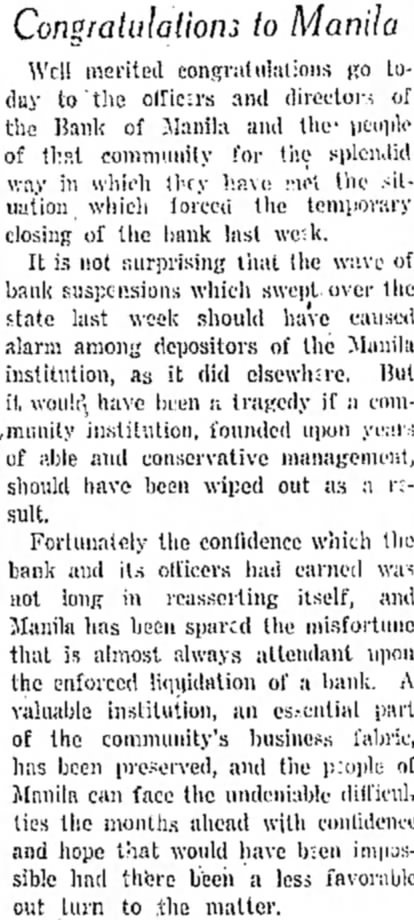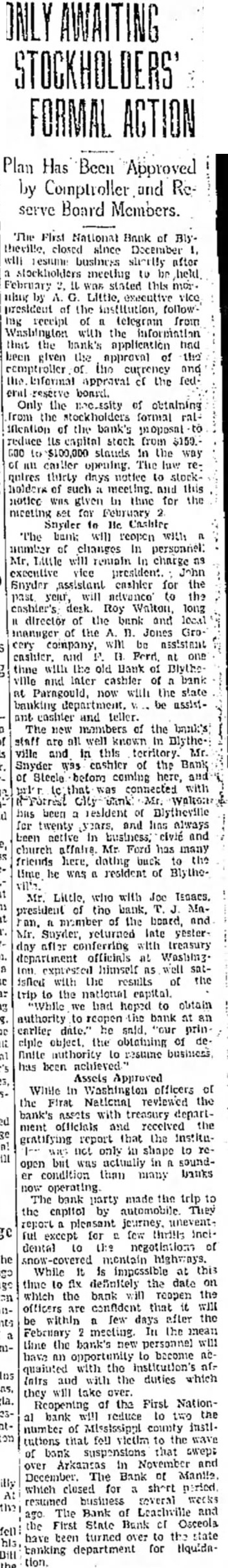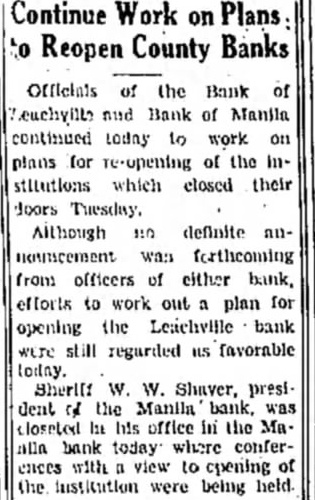 PLANS STARTED TO REOPEN ALL OR MOST BANKS A. B. BANKS CONFERRING RAPIDLY AS POSSIBLE WITH THE LEADERS OF 49 BANKS OPTIMISM FELT Officials Declare Most of Suspended sulting, from American Exchange ever Closing Little Rock, Nov. 18.-(AP). Financial leaders struck a note of uptimlsm today as negotiations went forward for the reopening 01 most of the forty-nine banks in the state closed or suspended in the past two days Nine additional small institutions closed under a fiv. day suspension or were taken over by the state banking department today One of these was in the so-called A. B. Banks group, as were most of those closing or ceasing business temporarily yesterday after the American Exchange Trust Company, Little Rock, suspended for five days. Although the institutions are known as the A. B. Banks group Mr. Banks, the controlling stockholder in most of them. explained they are separate units and not affiliated with the American-Exchange here Mr. Banks said he was conferring as rapidly as possible with the board of the various banks. including the American-Exchange, with view to reopening within the five day period or reorganizing and reopening soon. Officials said most of the suspended banks closed as a precautionary measure because of hysteria resulting from the AmericanExchange suspension. The banks suspending today for days were the bank of at Waldo, in the A. B. Banks group, and the following independent intitutions: of Manila at Manila Lepanto, the Viola State Bank at Viola, and the Bank of Pollard, were taken in charge by the state banking department. Both were independent units. State banking department officials nearly all the suspended banks were engaged in efforts to notices were received this mornstatements House Association Mr. Banks himelf, and others. The Clearing House said all banks in Little Rock and condition and able "to meet the hanking needs of the community.' Senator Joe Robinson and Governor Harvey Parnell expresed confidence in the soundness of the state's financial structure and a hope for the cooperaiton of the public with the banks & banks with Referring to the which he is associated, Mr. Banks, said he knew the people of these towns are gravely interested to know when the banks will be re"That will be determined," he added, "by the local boards with whom I am conferring as rapidly as possible As soon as they asthemselves by supand porting otherwise that capital or they are the of free from danger run, they will resume normal "In Little Rock the executive committee of the American-Exchange Trust Company is working on the problem but as yet has reported no plan