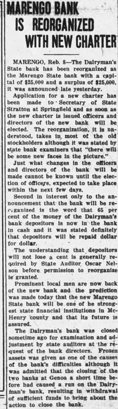 MARENGO BANK IS REORGANIZED WITH NEW CHARTER MARENGO, Reb. 8-The Dairyman's State bank has been reorganized as the Marengo State bank with a capital of $25,000 and a surplus of $25,000, it was announced late yesterday. Application for a new charter has been made to Secretary of State Stratton at Springfield and as soon as the new charter is issued officers and directors of the new bank will be elected. The reorganization, it is understood, takes in most of the old stockholders although it was stated by state bank examiners that "there will be some new faces in the picture." Just what changes in the officers and directors of the bank will be made cannot be known until the election of officers, expected to take place within the next few days. Second in interest only to the announcement that the bank will be reorganized is the word that 65 per cent of the money of the Dairyman's bank depositors is now in the bank in cash and it was stated definitely that depositors will be repaid dollar for dollar. The understanding that depositors will not lose a cent is generally required by State Auditor Oscar Nelson before permission to reorganize is granted. Prominent local men are now back of the new bank and the prediction was made today that the new Marengo State bank will be one of he strongest state financial institutions in McHenry county and that its future is assured. The Dairyman's bank was closed sometime ago for examination and adjustment by state auditors at the request of the bank directors. Frozen assets was given as one of the causes of the bank's difficulties although it was admitted that the closing of the two banks at Genoa a short time before had caused a run on the Dairyman's bank, resulting in withdrawal of sufficient funds to bring about the action to close the bank.