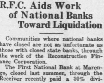 RECEIVER GRANTED LOAN OF $65,000 BY RECONSTRUCTION FINANCE CORPORA. TION DIVIDEND CHECKS NOW IN WASHINGTON -RECEIVER WINS LEGAL FIGHT INVOLVING TITLE TO COMMUNITY BUILDING MARENGO BANK FAILED AUG. 27, 1932.