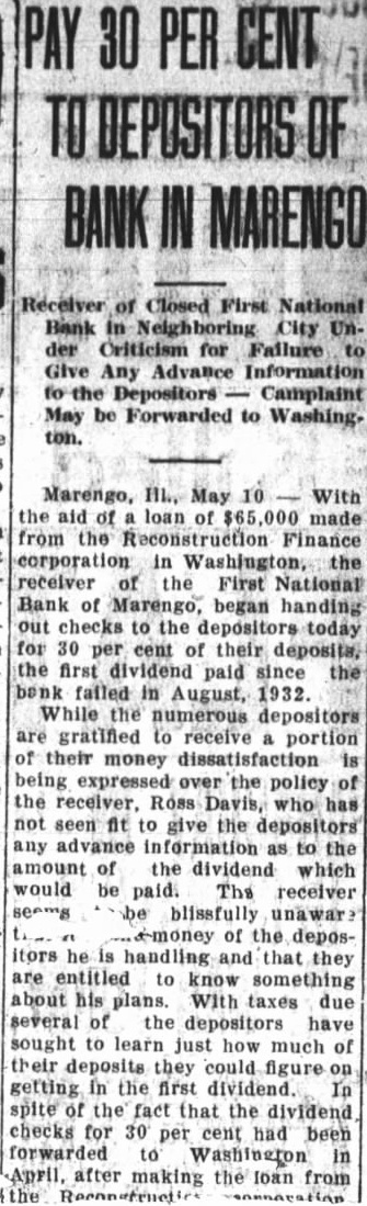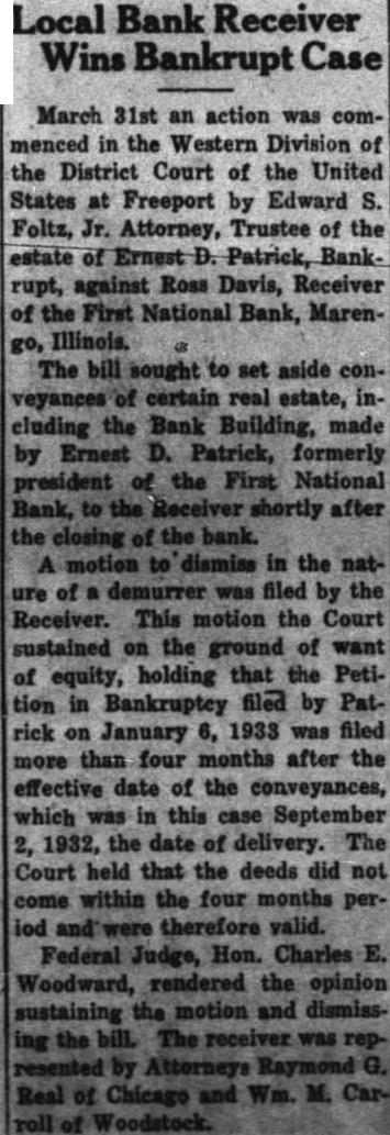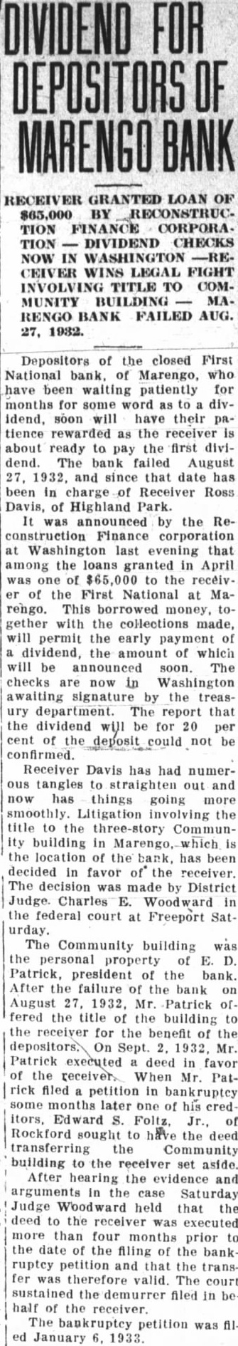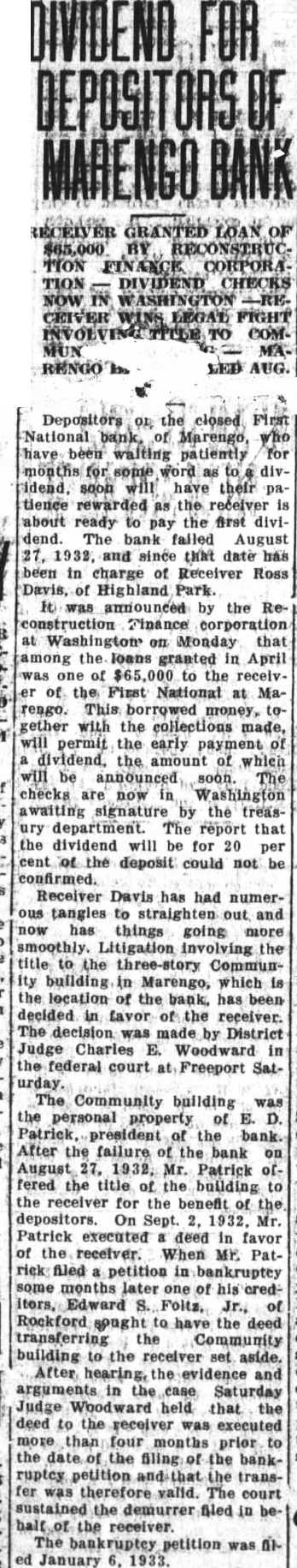 Depositors of the closed First National bank, of Marengo, who have been waiting patiently for months for some word as to a dividend, soon will have their patience rewarded as the receiver is about ready to pay the first dividend. The bank failed August 27, 1932, and since that date has been in charge of Receiver Ross Davis, of Highland Park. It was announced by the Reconstruction Finance corporation at Washington last evening that among the loans granted in April was one of $65,000 to the receiver of the First National at Marengo. This borrowed money, together with the collections made, will permit the early payment of a dividend, the amount of which will be announced soon. The checks are now in Washington awaiting signature by the treasury department. The report that the dividend will be for 20 per cent of the deposit could not be confirmed. Receiver Davis has had numerous tangles to straighten out and now has things going more smoothly. Litigation involving the title to the three-story Community building in Marengo, which is the location of the bank, has been decided in favor of the receiver. The decision was made by District Judge. Charles E. Woodward in the federal court at Freeport Saturday. The Community building was the personal property of E. D. Patrick, president of the bank. After the failure of the bank on August 27, 1932, Mr. Patrick offered the title of the building to the receiver for the benefit of the depositors.\ On Sept. 2. 1932, Mr. Patrick executed a deed in favor of the receiver. When Mr. Patrick filed a petition in bankruptcy some months later one of his cred itors, Edward S. Foltz, Jr., of Rockford sought to have the deed transferring the Community building to the receiver set aside. After hearing the evidence and arguments In the case Saturday Judge Woodward held that the deed to the receiver was executed more than four months prior to the date of the filing of the bankruptey petition and that the transfer was therefore valid. The court sustained the demurrer filed in behalf of the receiver. The bankruptcy petition was filed January 6. 1933.