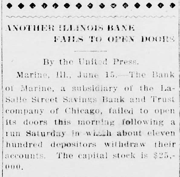 ANOTHER HALINOIS BANK FAHLS TO OPEN DOORS By the United Press. Marine, III., June 15. The Bank of Marine, a subsidiary of the LaSalle Street Savings Bank and Trust company of Chicago, failed to open its doors this morning following a run Saturday in wisch about eleven hundred depositors withdraw their accounts. The capital stock is $25,000.