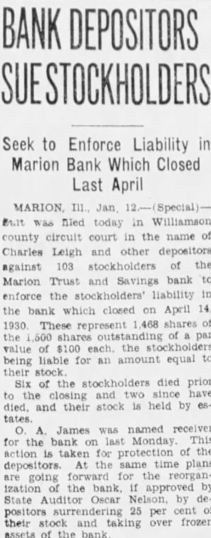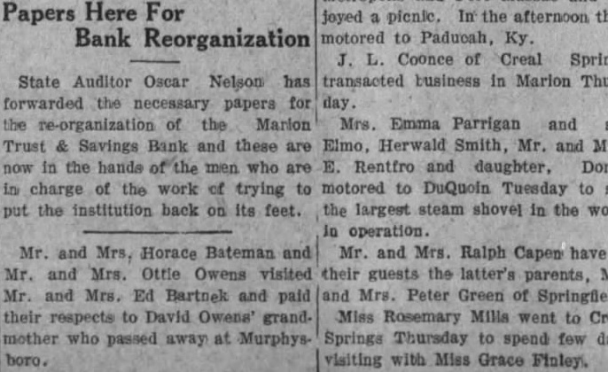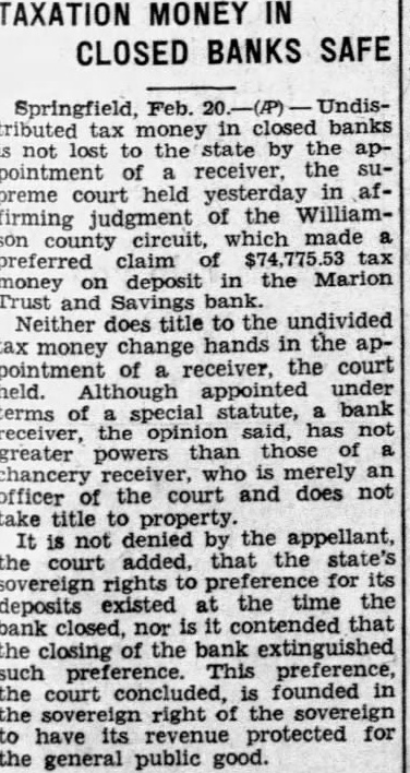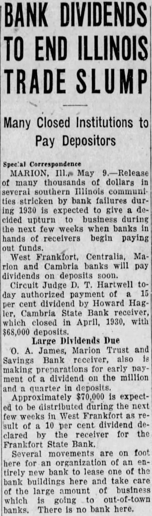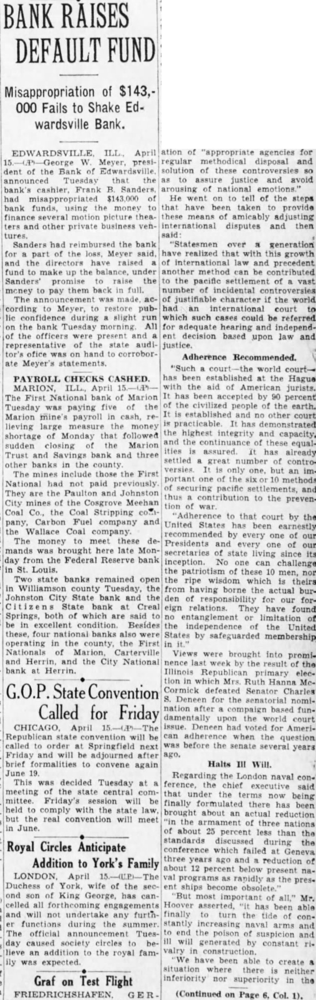 BANK RAISES Misappropriation of $143,000 Fails to Shake Edwardsville Bank. April ation of agencies for Meyer, presi- regular methodical disposal and dent of the Bank of solution of these announced Tuesday that to justice and arousing $143,000 He went tell the steps bank funds, using the money that have taken provide finance several motion picture means amicably adjusting and other private business disputes and then tures. Sanders had reimbursed the bank "Statesmen over generation for the loss, Meyer said, realized with growth the directors have raised international and precedent fund make the be contributed Sanders' promise the pacific settlement of vast them back full. number incidental The made, justifiable character the world cording to Meyer, restore an international court during slight such cases could referred the bank Tuesday morning. for adequate hearing and independofficers present and decision based upon law and representative of state audi- justice. hand corroborAdherence Recommended. Meyer's statements. PAYROLL CHECKS CASHED. MARION, ILL., April The First National bank Marion Tuesday paying five of the Marion mine's payroll lieving shortage Monday followed sudden closing the Marion Trust and Savings bank and three other banks the county The mines those the First National had paid previously They are the and Johnston City the Meehan Coal Co., the Coal Stripping pany, Carbon Fuel company and Wallace Coal company The money to meet these mands brought here late from the Federal Reserve bank Louis. Two state banks remained Williamson county Tuesday, Johnston City State bank the State bank Creal Springs, both of which are said in excellent Besides these, operating county, the First Nationals of Carterville and the City National bank at Herrin. "Such world has been established Hague jurists. been accepted by percent the civilized people the earth. established and other court highest integrity and capacity, the these ities assured. has already great controbut important the pacific and the prevention 'Adherence to that court by the United States earnestly by every one our Presidents every secretaries state living since its inception. No can challenge patriotism of these men, ripe wisdom which theirs having borne the actual burof for our relations. They have found entanglement limitation the independence the United by safeguarded membership Views were brought into prominence last week result the Illinois Republican elecprimary which Mrs. Ruth Hanna McConvention defeated Senator Charles Deneen for nomination after compaign based funCalled for Friday damentally upon the world court April Deneen voted for AmeriRepublican state convention be adherence when question called order Springfield next before the senate several years Friday will adjourned ago. brief formalities to convene Halts again June Regarding the London naval This decided Tuesday chief executive said meeting central that under the terms being mittee. Friday's be finally there has been comply with brought about actual reduction real convention will meet the armament of three nations June. about 25 percent less than standards discussed Royal Circles Anticipate conference which failed years ago reduction Addition to York's Family about 12 percent below present April programs rapidly the Duchess York, wife of the ships become obsolete." ond son King George, has can- "But most important celled all forthcoming Hoover has been will not undertake any furth- finally turn the tide functions during summer. naval arms The official poison suspicion and caused circles will generated by day society constant lieve an addition to the royal fam- construction. have been able to was expected. create situation where there neither Graf inferiority nor superiority in the on Flight (Continued on Page