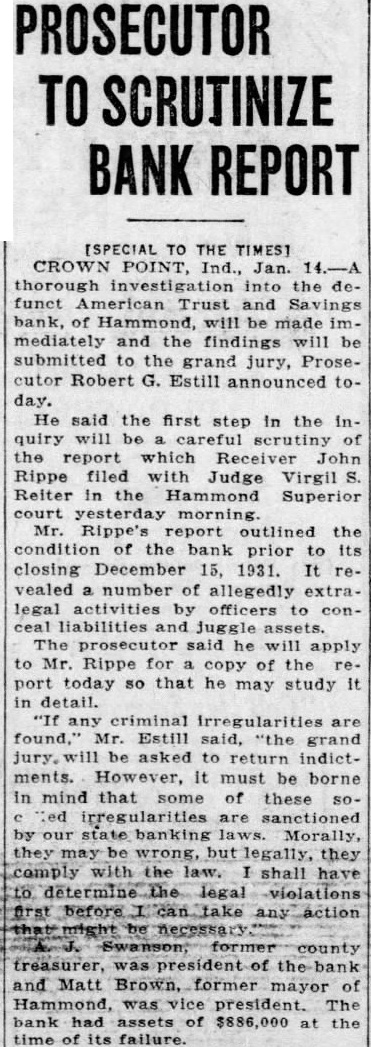 The frenzied, extra-legal attempts of officers of the defunct Americanยฎ Trust and Savings bank, of Hammond, to stave off insolvency vealed in the volumious 72-page report which Receiver John Rippe filed with Superior Judge Virgil Reiter this morning, outlining the condition of the bank before it was closed and the status of the receivership during the last 12 months. Between the dry, crisp, legal terminology the report may be read dramatic story by the initiated It is age-old story of juggled concealed liabilities, entries, and similar irregularities. To start the beginning, the bank closed December 15, 1931, with reported total assets of $888,742.53. that amount, $157,727.51 were listed trust securities and first lien trust