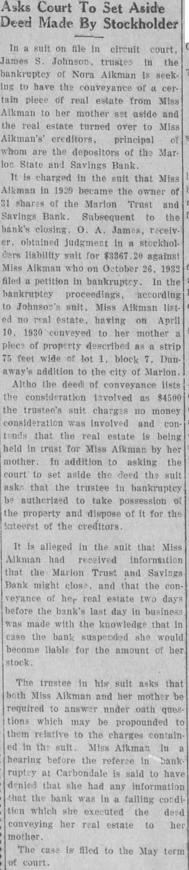 In suit on file in circuit court, James Johnson, trustes in the bankruptcy of Nora Aikman is seek. ing to have the conveyance of a cer tain piece of real estate from Miss Aikman to her mother set aside and the real estate turned over to Miss Alkman's' creditors, principal of whom are the depositors of the Marlon State and Savings Bank. It is charged in the suit that Miss Alkman in 1929 became the owner of 31 shares of the Marion Trust and Savings Bank. Subsequent to the bank's closing. James, receiver, obtained judgment in stockholders liability suit for $3367 against Miss Aikman who on October 26, 1932 filed petition in bankruptcy. In the bankruptcy proceedings, according to Johnson's suit, Miss Alkman listed no real estate, having on April 10. 1930 conveyed to her mother piece of property described as a strip 75 feet wide of lot block Dunaway's addition to the city of Marion. Altho the deed of conveyance lists the consideration involved as $4500 the trustee's suit charges no money consideration was involved and tends that the real estate is being held in trust for Miss Alkman by her mother. In addition to asking the court to set aside the deed the suit asks that the trustee in bankruptcy be authorized to take possession of the property and dispose of it for the inteerst of the creditors