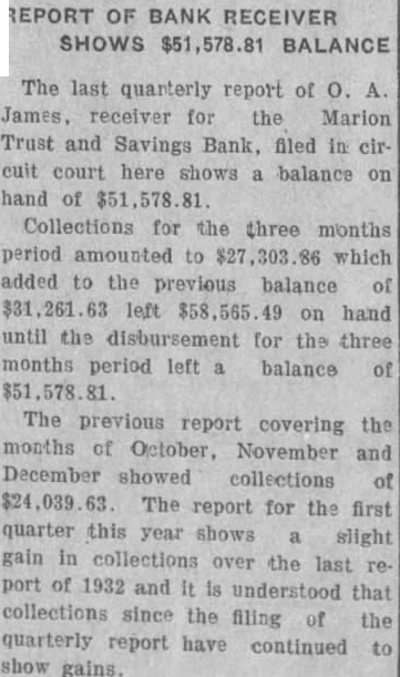The last quarterly report of O. James, receiver for the Marion Trust and Savings Bank, filed in cuit court here shows balance on hand of $51,578.81 Collections for the three months period amounted to which added to the previous balance of left 49 on hand until the disbursement for the three months period left balance of The previous report covering the months of October, November and December showed collections of The report for the first quarter this year shows slight gain in collections over the last port of 1932 and it is understood that collections since the filing of the quarterly report have continued to show gains.