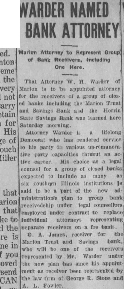 That Attorney Warder Marion is to be appointed attorney for the receivers group of closbanks including the Marion Trust and Savings Bank and the Herrin State Savings Bank was learned here Saturday morning. Attorney Warder lifelong Democrat who has rendered service to his party in various tive party capacities thruout an tive His choice as legal counsel for group of closed banks expected include many couthern Illinois institutions said to be part of the new ministration's plan to group bank receivedship under legal counsellors employed under contract to replace individual attorneys representing separate receivers on fee basis James, receiver for the Marion Trust and Savings bank, who will be one of the receivers represented by Mr. Warder under the new plan has since his appointment receiver been represented the law firm Stone and