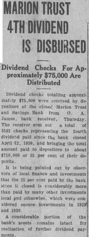 Dividend checks totalling approximately received by positors of the closed Marion Trust and Savings Bank from James, bank receiver, Thursday. The receiver sent out total 3583 checks representing the fourth dividend paid since the bank closed April 1930, and bringing the total amount paid depositors to about or 35 per cent of their pceits. It being pointed out by observors of local finance and investments that the 35 per cent paid by bank the since closed considerably more than paid by many other investments local and otherwise, which considered secure investments in 1929 and considerable portion of the bank's assets intact for realization of further dividend ments.