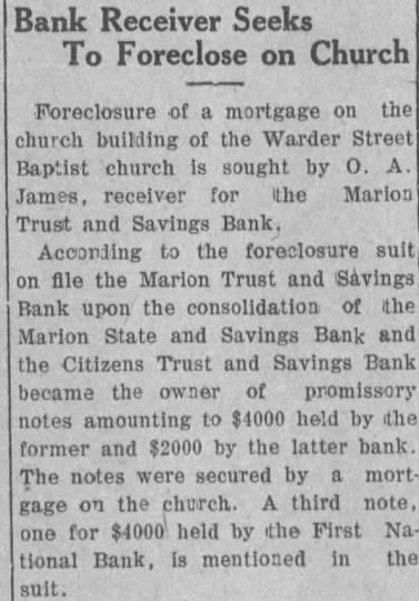 Foreclosure of a mortgage on the church building of the Warder Street Baptist church is sought by O. A James, receiver for the Marion Trust and Savings Bank. According to the foreclosure suit on file the Marion Trust and Savings Bank upon the consolidation of the Marion State and Savings Bank and the Citizens Trust and Savings Bank became the owner of promissory notes amounting to $4000 held by the former and $2000 by the latter bank. The notes were secured by a mortgage on the church. A third note, one for $4000 held by the First National Bank, Is mentioned in the suit.