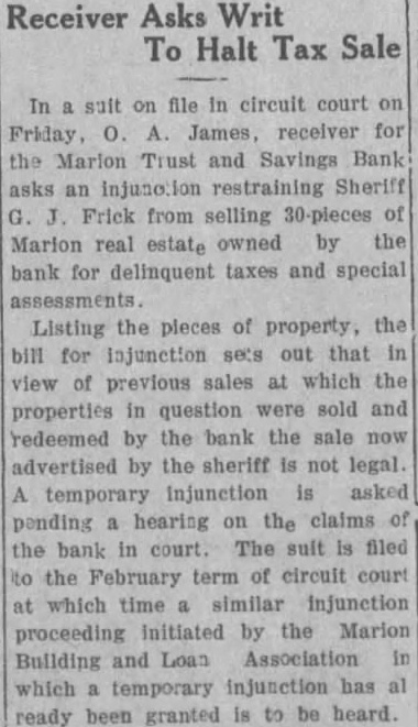In a suit on file in circuit court on Friday, O. A. James, receiver for the Marion Trust and Savings Bank asks an injunction restraining Sheriff G. J. Frick from selling 30-pieces of Marion real estate owned by the bank for delinquent taxes and special Listing the pieces of property, the bill for injunction sets out that in view of previous sales at which the properties in question were sold and redeemed by the bank the sale now advertised by the sheriff is not legal. A. temporary injunction is asked pending a hearing on the claims of the bank in court. The suit is filed to the February term of circuit court at which time a similar injunction proceeding initiated by the Marion Building and Loan Association in which a temporary injunction has al ready been granted is to be heard.
