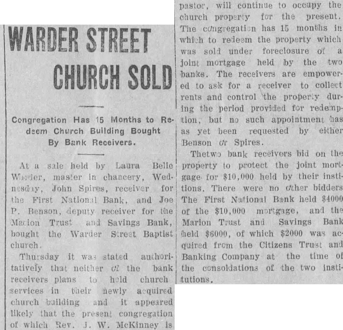 At a sale held by Laura Belle Warder, master in chancery, Wednesday, John Spires, receiver for the First National Bank and Joe P. Benson, deputy receiver for the Marion Trust and Savings Bank, bought the Warder Street Baptist church
