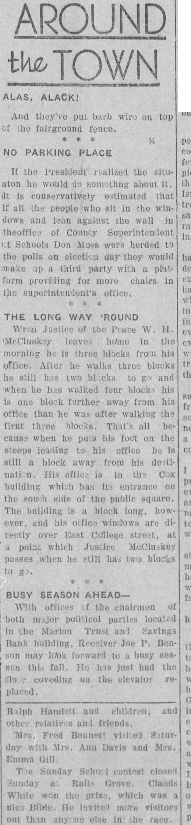 Wren Justice of the Peace H. McCluskey leaves home in the morning he is three blocks from his office. After he walks three blocks he still has two blocks to go and when he has walked four blocks his is one block further away from his office than he was after walking the firnt three blocks That's all because when he puts his foot on the steeps leading to his office he is still a block away from his destination. His office is in the Cox building which has its entrance on the south side of the public square. The building is block long, however, and his office windows are directly over East College street, at point which Justice McCluskey passes when he still has two blocks to