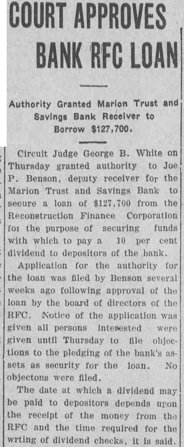 Circuit Judge George B. White on Thursday granted authority to Joe Benson, deputy receiver for the Marion Trust and Savings Bank to secure loan of from the Reconstruction Finance Corporation for the purpose of securing funds with which to pay 10 per cent dividend to depositors of the bank. Application for the authority for the loan was filed by Benson several weeks ago following approval of the loan by the board of directors of the RFC. Notice of the application was given all persons interested given until Thursday to file objections to the pledging of the bank's as security for the loan. No objectons were filed. The date which dividend may be paid to depositors depends upon the receipt of the from the money RFC and the time the required for wrting of dividend checks, it is said.
