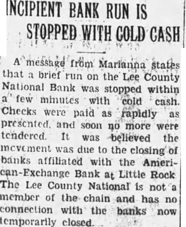 INCIPIENT BANK RUN IS STOPPED WITH COLD CASH A message from Marianna states that a brief run on the Lee County National Bank was stopped within few minutes with cold cash. Checks were paid as rapidly as presented. and soon no more were tendered It was believed the movement was due to the closing of banks affiliated with the American-Exchange Bank at Little Rock The Lee County National is not a member of the chain and has no connection with the banks now temporarily closed.