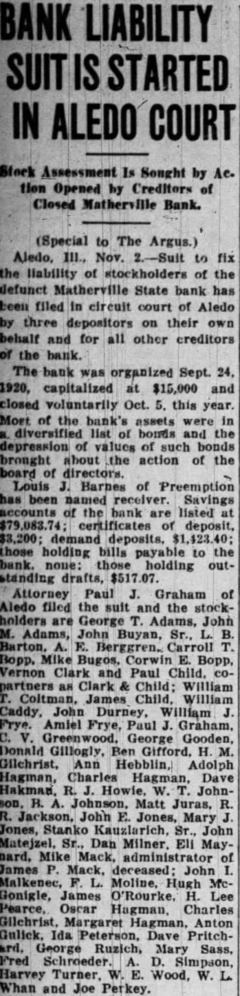 BANK LIABILITY STARTED IN ALEDO COURT Stock Assessment Sought tion Opened by Creditors of Closed Matherville Bank. (Special to The Argus.) Aledo, III., Nov. to fix the liability of stockholders of the defunct Matherville State bank has been filed in circuit court of Aledo by three depositors on their own behalf and for all other creditors the bank. bank organized Sept. 24, 1920, capitalized at $15,000 and closed voluntarily Oct. this year. Most of the bank's assets diversified list bonds and the depression of values of such bonds brought about action of the board of directors. Louis of been Savings accounts of the bank are listed certificates of deposit, $3,200; demand deposits, those holding bills payable to the bank. none: those holding standing drafts, Attorney Paul Graham of Aledo filed the suit and the stockholders are George Adams, John Adams, John Buyan, Carroll Bopp. Mike Bugos, Corwin Bopp, Vernon Clark and Paul Child. Clark Child: William Coltman, James Child, Caddy. John Durney, William Frye. Amiel Frye, Paul Greenwood. George Gooden, Donald Gillogly, Ben Gifford, Ann Hebblin, Adolph Hagman, Charles Hagman, Dave Hakman. R. Howie. W. JohnB. Johnson, Matt Juras, Jackson, John Jones, Mary Jones, Stanko Kauzlarich, John Matejzel, Dan Milner. Ell Maynard, Mike Mack, administrator James Mack, John Malkenec, Moline. Hugh McGonigle, James O'Rourke. Oscar Charles Margaret Hagman, Anton Gulick. Ida Peterson. Dave PritchGeorge Ruzich, Mary Sass, Schroeder. Harvey Wood, Whan and Joe Perkey.