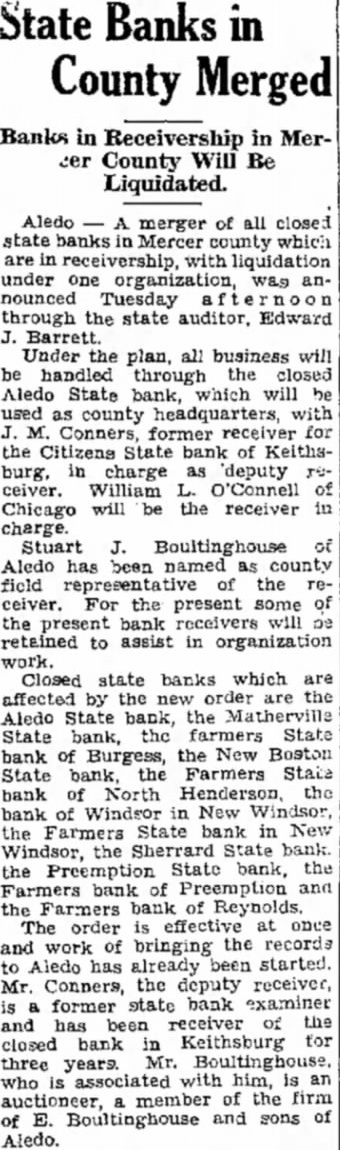 State Banks in County Merged Banks in Receivership in cer County Will Be Liquidated. Aledo merger of all closed state banks Mercer which are receivership, with liquidation under one organization, was nounced Tuesday through the state auditor, Edward Under the plan, all business will be handled through the closed Aledo State bank, which will used as county headquarters, with Conners, former receiver the Citizens State bank of Keithsburg, in charge as deputy ceiver. William O'Connell Chicago will be the receiver charge. Stuart Boultinghouse Aledo has been named county field representative of the ceiver. For the present some the present bank receivers will retained to assist in organization work. Closed state banks which affected by the new order the Aledo State bank, the Matherville State bank, the farmers State bank of Burgess, the New Boston State bank, the Farmers State bank of North Henderson, the bank of Windsor in New Windsor, the Farmers State bank in New the Sherrard State bank. the State bank, Farmers bank the Farmers bank Reynolds. The order effective once of bringing the records and work Aledo has already been started. Mr. Conners, the deputy receiver, former state bank examiner receiver of the and has been closed bank Keithsburg for three years. Mr. Boultinghouse, who associated with him, auctioneer, member of the firm of and sons of Aledo.