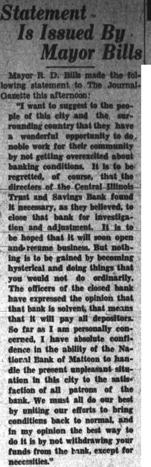 Mayor Gazette want suggest the the have wonderful work for regretted, course, the and Savings found necessary, as they believed, close that bank investigation and be hoped that will But nothgained becoming hysterical and doing things would not ordinarily. The officers of the closed bank expressed the opinion that that bank that means that pay depositors. far am personally cerned, absolute confidence the ability of the National Bank of Matteon hanthe situation this city the satisfaction patrons the We must all best bank. uniting our efforts to bring conditions back to normal, and in the best way my by not withdrawing your funds from the bank, for