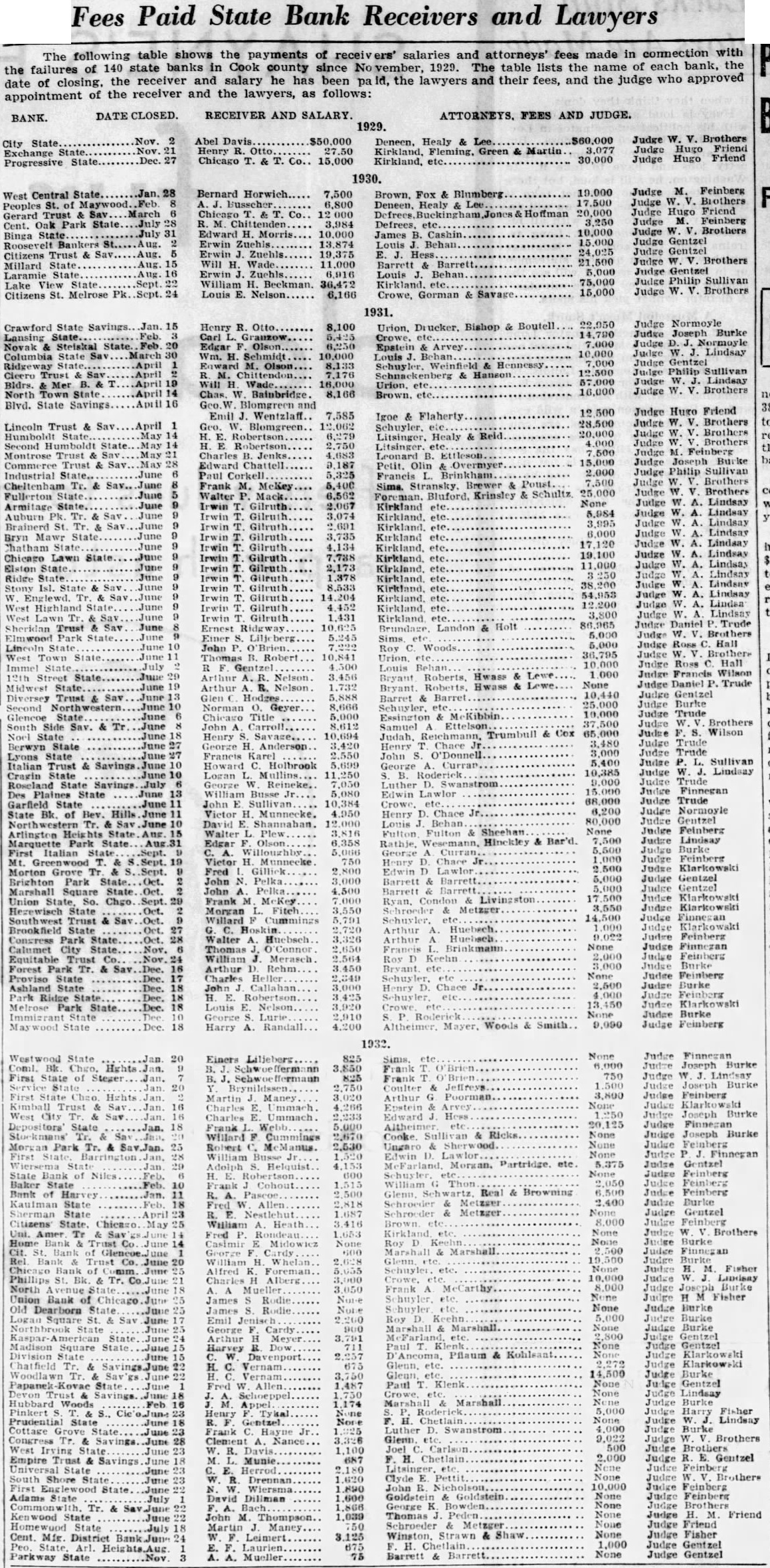 Fees Paid State Bank Receivers and Lawyers The following table shows the payments of receivers' salaries and attorneys' fees made in connection with banks in Cook 1929. The table lists the name of each bank, the the failures of 140 state county since vember, date of closing. the receiver and salary he has been pa Id, the lawyers and their fees, and the judge who approved appointment of the receiver and the lawyers, as follows: BANK. DATE CLOSED. RECEIVER AND SALARY. ATTORNEYS. FEES AND JUDGE. 1929. Judge Brothers Nov. Abel Healy & City Henry 27.50 Martin Judge Exchange Friend Progressive State. Chicago T. & T. 15,000 1930. Judge Feinberg West Central State Bernard Horwich Blumberg Biothers Peoples Healy Hoffman Hugo Friend Gerard Trust March 3,250 Judge Feinberg Cent. Oak 3,984 10,000 Judge Brothers Binga Edward James Bankers 13.874 Judge Gentzel Louis Behan Citizens Trust Millard Will Barrett.. 6,916 Judge Sullivan Lake View William 36,472 15,000 Judge Brothers Citizens St. Melrose Louis 6,166 Gorman Savage 1931. Crawford State Henry Otto. 8,100 Joseph Burke Edgar Columbia Philip Cleero Trust Sav Wade Brothers North Chas Blvd. State Savings Judge Friend Lincoln Trust April Healy Second Humboldt Montrose Charles Trust Petit. Olin Overmyer Frank Brewer & Judge Fullerton Walter Krinsley None Judge Armitage Irwin Kirkland Judge Auburn Irwin Brainerd St. Judge Bryn Mawr State. Kirkland Judge Lindsay Irwin Judge Chicago Lawn Gilruth Ridge Irwin Isl. Judge etc. etc. Sav etc. Judge Trude Landon Judge Elmwood Sims Judge State Town Louis Wilson Street Hwass None Judge Trude State Hwass Trust Second Trude Brothers South Side Trumbull Cox Wilson State Berwyn Trude Lyons State Francis Sullivan Savings Holbrook Lindsay Cragin Roseland State Savings Des Trude Garfield State State Victor Chace 6,200 of Sheehan Judge Arlington Hinckley Lindsay State Aug.31 Edgar First Italian Feinbers Morton Grove Fred Park Union Chgo Frank Metzger Judge Morgan Judge Brookfield Congress Feinberg Park Walter Judge Forest Park Sav Charles Judge Proviso Ashland Judge Park Melrose Park Judge Burke Judge None Judge Einers 3,800 City Ricks State State Gentzel Amer None Brothers Burke Fisher North Union Bank Dearborn None 14,500 Marshall Fisher Swanstrom Savings Gentzel Empire South Adams July John Friend Schroeder Metzger Judge July Shaw Judge Fisher District 1,000 Judge Gentzel E. Parkway State 75 None Judge Gentzel