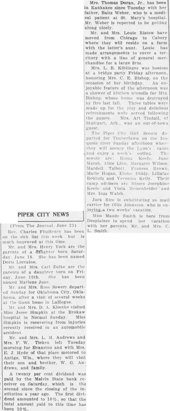 June 24, Melvin wins three, loses two ball games that week. June 27, Mrs. Johanna Bonnen died at her home near Guthrie. June 25, Miss Hilda Steinke and Richard Cosgren of Chicago married. June 25, Myrtle Gedelman passed away at her home in Harvey. June 25, Earl DeWall receives Peach Orchard scholarship. To be Continued.