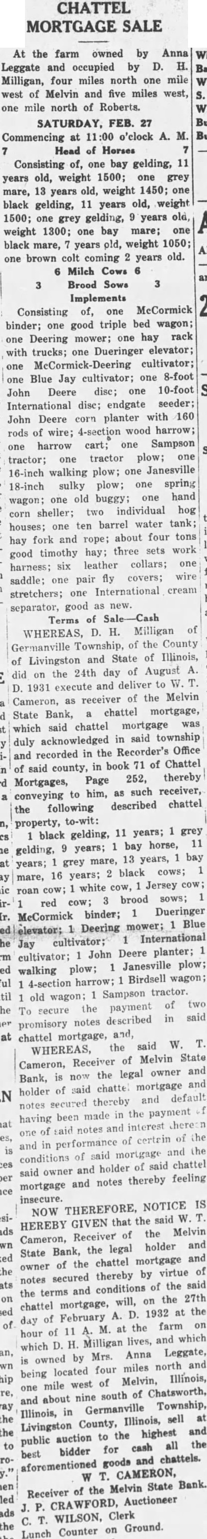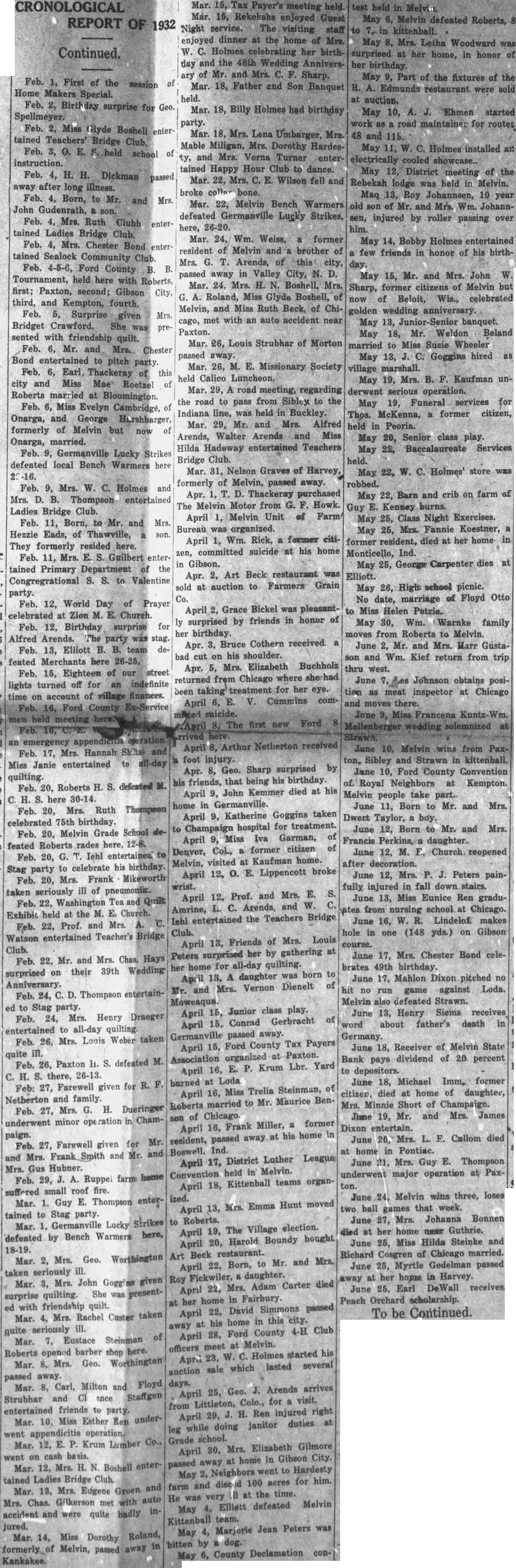 Feb. First of the session of Home Makers Special. Feb. 2, Birth day surprise for Geo. Spellmeyer. Feb. 2, Miss Glyde Boshell tained Teachers' Bridge Club. Feb. 3, held school of instruction. Feb. 4, H. H. Dickman passed away after long illness. Feb. 4, Born, to Mr. and Mrs. John Gudenrath, son. Feb. Mrs. Ruth Clubb entertained Ladies Bridge Club. Feb. 4, Mrs. Chester Bond tained Sealock Community Club. Feb. 4-5-6, Ford County B B. Tournament, held here with Roberts, first; Paxton, second; Gibson City, third, and Kempton, fourth. Feb. 5, Surprise given Mrs. Bridget Crawford. She was presented with friendship quilt. Feb. 6, Mr. and Mrs. Chester Bond entertained to pitch party Feb. 6, Earl, Thackeray of this city and Miss Mae Roetzel of Roberts married at Bloomington. Feb. 6, Miss Evelyn Cambridge, of Onarga, and George Hurshbarger, formerly of Melvin but now of Onarga, married. Feb. Germanville Lucky Strikes defeated local Bench Warmers here Feb. 9, Mrs. W. C. Holmes and Mrs. D. B. Thompson entertained Ladies Bridge Club. Feb. 11, Born, to Mr. and Mrs. Hezzie Eads, of Thawville, son. They formerly resided here. Feb. 11, Mrs. Guilbert in tained Primary Department of the Congregrational S. S. to Valentine party. Feb. 12, World Day of Prayer celebrated at Zion M. E. Church. Feb. 12, Birthday surprise for Alfred Arends. The party was stag. Feb. 13, Elliott B. B. team defeated Merchants here 26-25. Feb. 15, Eighteen of our street lights turned off for an indefinite time on account of village finances. Feb. 16, Ford County men held meeting an Feb. 17, Mrs. Hannah and Miss Janie entertained to all-day quilting. Feb. 20, Roberts H. defeated C. H. S. here 30-14. Feb. 20, Mrs. Ruth Thompson celebrated 75th birthday. Feb. 20, Melvin Grade School feated Roberts rades here, 12-8. Feb. 20, Iehl entertained to Stag party to celebrate his birthday. Feb. 20, Mrs. Frank Mikeworth taken seriously ill of pneumonia. Feb. 22, Washington Tea and Quilt Exhibit held at the M. E. Church. Feb. 22, Prof. and Mrs. A. Watson entertained Teacher's Bridge Club. Feb. 22, Mr. and Mrs. Chas. Hays their 39th Wedding surprised on Anniversary. Feb. 24, Thompson entertained to Stag party. Feb. 24, Mrs. Henry Draeger entertained to all-day quilting. Feb. 26, Mrs. Louis taken quite ill. Feb. 26, Paxton H. S. defeated M. C. H. S. there, 26-13. Feb: 27, Farewell given for Netherton and family. Mrs. G. H. Dueringer Feb. 27, son underwent minor operation in Champaign. Feb. 27, Farewell given for Mr. and Mrs. Frank Smith and Mr. and Mrs. Gus Hubner. Feb. 29, J. A. Ruppel farm home suffered small roof fire. ized. Mar. 1. Guy E. Thompson entertained to Stag party. to Mar. 1, Germanville Lucky Strikes defeated by Bench Warmers here, 18-19. Art Mar. 2, Mrs. Geo. Worthington taken seriously ill. Mar. 3, Mrs. John Goggins given She was presentsurprise quilting. ed with friendship quilt. Mar. 4, Mrs. Rachel Custer taken quite seriously ill. of Mar. 7, Eustace Steinman Roberts opened barber shop here. Mar. 8, Mrs. Geo. Worthington passed away Mar. 8, Carl, Milton and Floyd Strubhar and CI ence Staffgen entertained friends to party. underMar. 10, Miss Esther Ren went appendicitis operation. Mar. 12, E. Krum Lumber Co., went on cash basis. Mar. 12. Mrs. H. Boshell entertained Ladies Bridge Club. Mar. 13, Mrs. Eugene Groen and Mrs. Chas. Gilkerson met with auto accident and were quite badly injured. Mar. 14, Miss Dorothy Roland, in formerly of Melvin, passed away Kankakee.