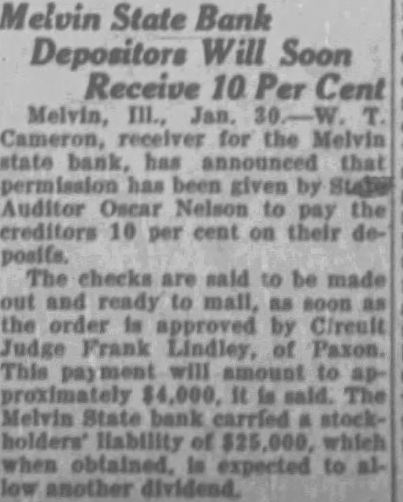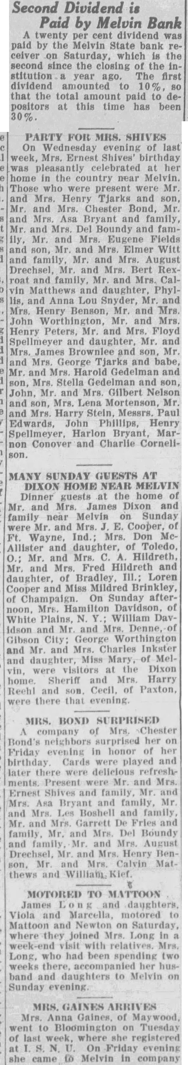 May 15, Mr. and Mrs. John W. Sharp, former citizens of Melvin but now of Beloit, Wis., celebrated golden wedding anniversary. May 13, banquet. May 18, Mr. Weldon Beland married to Miss Susie Wheeler May 13, J. C. Goggins hired as village marshall. May 19, Mrs. Kaufman underwent serious operation. May 19, Funeral services for Thos. McKenna, former citizen, held in Peoria. May 20, Senior class play. May 22, Baccalaureate Services held. May 22, W. C. Holmes' store was robbed. May 22, Barn and crib on farm of Guy E. Kenney burns. May 25, Class Night Exercises. May 25, Mrs. Fannie Koestner, former resident, died at her home in Monticello, Ind. May 25, George Carpenter dies at Elliott. May 26, High school picnic. No date, marriage of Floyd Otto to Miss Helen Petrie. May 30, Wm. Warnke family moves from Roberts to Melvin. June 2, Mr. and Mrs. Harr Gustason and Wm. Kief. return from trip thru west. June Johnson obtains position as meat inspector at Chicago and moves there. June 9, Miss Francena Kuntz Mellenberger wedding solemnized at Strawn. June 10, Melvin wins from Paxton, Sibley and Strawn in kittenball. Jane 10, Ford County Convention of Royal Neighbors at Kempton. Melvin people take part. June 11, Born to Mr. and Mrs. Dwert Taylor, boy. June 12, Born to Mr. and Mrs. Francis Perkins, daughter. June 12, M. Church. reopened after decoration. June 12, Mrs. P. J. Peters painfully injured in fall down stairs. June 13, Miss Eunice Ren graduates from nursing school at Chicago. June 16, W. R. Lindelof makes hole in one (148 yds.) on Gibson course. June 17, Mrs. Chester Bond celebrates 49th birthday. June 17, Mahlon Dixon pitched no hit no run game against Loda. Melvin also defeated Strawn. June 13, Henry Siems receives word about father's death in Germany. June 18, Receiver of Melvin State Bank pays dividend of 20 percent to depositors. June 18, Michael Imm, former citizen, died at home of daughter, Mrs. Minnie Short of Champaign. June 19, Mr. and Mrs. James Dixon entertain. June 20, Mrs. L. F. Cullom died at home in Pontiac. June 21, Mrs. Guy E. Thompson underwent major operation at Paxton.