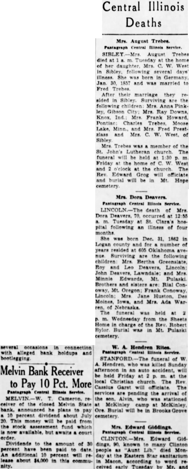 Central Illinois Deaths Mrs. August Trebes. Pantagraph Central Illinois Service. August Trebes Tuesday W. West Sibley, several illness. She born in Jan. 1857 and married Fred Trebes. After their marriage they sided the following Gibson City: Mrs. Ray Mrs Frank Pontiac Charles Moose Minn., Mrs. Fred Prestzlass and Mrs. of Sibley Mrs. Trebes member John's The funeral will be held Friday the W. and o'clock the The Edward officiate and burial will be Mt. Hope cemetery. Mrs. Dora Deavers. Pantagraph Central Illinois Service. death of Mrs. Dora Deavers. occurred Tuesday St. Clara's hospital following an illness of four months She was born Dec. 31, 1862 Logan county and years resided 605 Surviving are the following children: Mrs. Bertha Roy Leo Deavers. Lincoln: John and Mrs Minnie Mt. Brothers sisters Rial ConMt. Oregon: Frank Conoway, Jane Des and Mrs. Ada Warof The funeral held Wednesday from the Sheets Home charge the Rev. Robert Burial was Mt. Pulaski cemetery. Hendren Rites. funeral of Hendren. was killed Sunday Melvin Bank Receiver an auto held Friday the local Christian church. The Rev to Pay 10 Pct. More Cassius Garst will The services are pending the arrival the who stationed ceiver closed Melvin State McKinley camp bank, he plans Burial will be in percent dividend about cemetery This money will be paid from stock assessment fund which Mrs. Edward Giddings. available, but awaits court order. Edward Dividends to the amount of dings, Clinton known many percent have been paid people "Aunt died additional 10 percent will the Eastern Star sanitarium lease about $4,000 this commu- Macon. according word nity. ceived early Tuesday by Mr. and