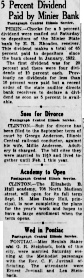 Pantagraph for percent dividend were mailed out Saturday depositors of the Minier State bank receiver. This dividend makes total of paid to depositors since the bank closed In January. 1932. The first dividend was for percent and there were four dividends percent each. Prevlously no dividends for less than were paid but recent order of the auditor directs bank to declare as soon percent available.