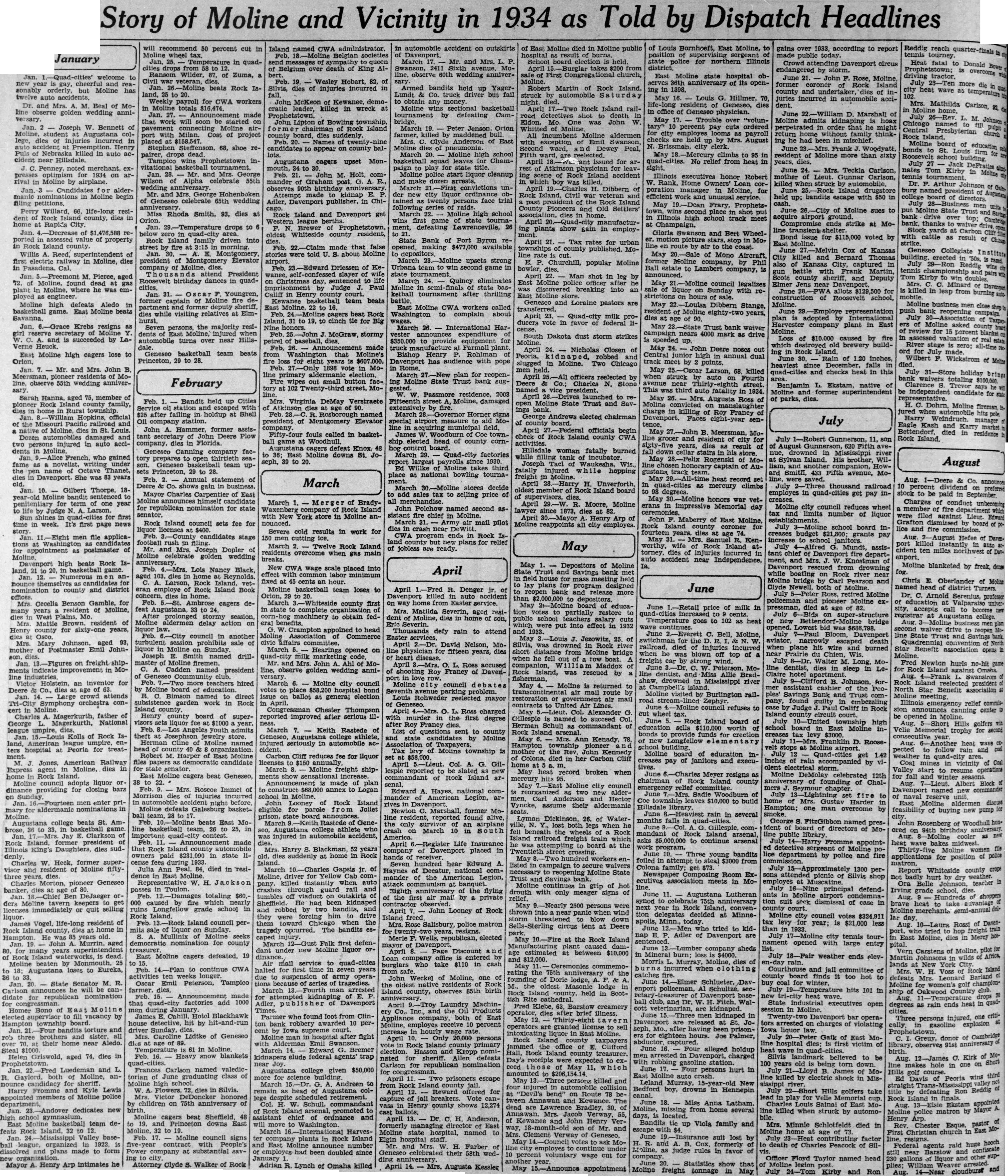 of Moline and in 1934 Headlines Story Vicinity by Dispatch as January welcome to new year cheerful and sonably orderly, but Moline has twelve auto accidents. Dr. and Mrs. Beal of Moobserve golden wedding anniJan. Joseph W. Bennett Moline, Augustana lege, dies of killed in auto accident Hillsdale. Penney, noted merchant, presses optimism 1934 on rival in Moline airplane. Candidates aldermanic in Moline begin filing petitions. Perry Willard, resident Rock Island county, dies in home at Rapids City. Jan. of ported assessed value property Rock Island county. Willis Reed, superintendent of first electric railway in Moline, dies Pasadena, Cal. Pierce, aged Moline, found dead at gas plant Moline, where he was ployed engineer. Moline high defeats Aledo basketball game. East Moline Savanna. Krebs resigns of Moline succeeded by Verne Heuck. East Moline high cagers lose to and Mrs. John Meersman, pioneer residents of Moobserve 55th wedding anniverSarah Hanna, aged member of Rock Island family, in home Jan. official and of Moline, dies in Dozen and injured in auto accidents in Moline. French, who gained fame novelist, writing under name Octave Davenport. She years 10. Gilbert Thorpe, 18Moline bandit to penitentiary for term Judge Larson. Sun shines in for first time week. story. men file applications candidates postmaster Davenport high beats Rock land, game. Jan. Numerous themselves to county and district offices. Mrs. Cecelia Benson Gamble, for resident of Moline, many years Plains, Mo. Mattie Brown. resident of Henry county for Osco. Mrs. Mary aged 93, mother of Postmaster Emil JohnJan. on ments indicate in industries. Victor an inventor for Deere dies age Large attends Symphony Moline. Magerkurth, father of Charles National George league umpire, dies. Kolls of Rock Jan. land, American league umpire, hospital Peoria for treatters ment. Jones, American Railway Express agent Moline, dies home Rock Island. Moline council adopts liquor dinance for closing Jan. enter college beats St. AmAugustana brose, to Clarkson of Jay Rock Island, former president Illinois King's Daughters, dies sudCharles Heck, former supervisor resident of Moline three dies. Charles pioneer Geneseo banker, Jan. Ben DeJaeger ders Moline tavern keepers licenses immediately or selling liquor. James resident Island county, at home Rock Hampton. He was 85 old. Murrin, aged Jan. for Rock dead. Moline beaten 18; Augustana loses to Eureka, to Senator be didate republican nomination Homer Bono of elected township board. torture and and sister, all their home near Aledo. $1000. Helen Griswold, aged dies Jan. Luedeman and Gaylord. both of Moline, announce candidacy for sheriff. Fromme Kyle Lewis Harry members of Moline police dedicates high school Moline basketball team feats Rock Island, 32 12. Valley baseorganized and plans made to form organization. Henry Arp intimates he Mayor recommend 50 percent in Moline wheel Temperature in quadcities drops from Ransom Wilder, of Zuma, veteran, beats Rock land, to Weekly for CWA workers in Moline totals Jan. 27. made that work will be started pavement connecting port Milan. Cost of project placed $158,547. Stephen Steffenson, 68, shoe pairer, dead. Tampico wins Prophetstown invitational Jan. Mr. and Mrs. George Wilson Alpha celebrate 55th wedding anniversary. and Mrs. George Hohenboken Geneseo celebrate 65th wedding anniversary. Miss Rhoda Smith, 93, dies Orion. Jan. drops below Rock Island family driven into street by fire in morning. Jan. Montgomery, president of Montgomery Elevator company Moline, dies. attend President birthday dances in quadcities. Jan. former captain of Moline fire partment deputy dies while visiting relatives Elmhurst. Seven the majority resipersons, dents East Moline, injured when automobile turns over near Hillsdale. Geneseo basketball team beats Princeton, February Bandit held up Cities Service station and escaped after failing in holdup Shell company station. John Hammer, former assistant of John Deere Plow company, dies in Florida. Geneseo Canning company facprepares open thirtieth Geneseo basketball team Princeton, to 28. Annual statement of Deere in Charles Carpentier of East Moline himself for republican nomination for state senator. Rock Island council sets fee for liquor licenses candidates stage football rush in filing. Mr. and Mrs. Joseph Dopler of Moline celebrate golden wedding anniversary. Feb. Lois Nancy Black, aged 103, dies home Reynolds. Larson, Rock Island. vetemploye Rock Island Book dies home. Feb. Ambrose cagers feat Augustana, to After prolonged session, Moline aldermen delay action liquor council another turbulent session sale liquor Moline Sunday. Joseph Smith named drillMoline firemen. Cadden named president club. teachers hired board education. Bimson named to direct subsistence garden work in Rock Island county. Henry county board of supervisors year. Angeles youth admits theft Josephson jewelry store. Herman Cline Moline named head of county 40 organization. Robert Harper East Moline files papers democratic candidate state senator. East Moline cagers beat Geneseo, Roscoe Immel of Morrison dies injuries incurred in night before. Moline defeats Galesburg beats East Mobasketball team, in important Feb. made that Rock county in state cense fees Julia Ann Peal, died in in East Moline. H. passes totaling caused by fire which nearly Longfellow grade school Rock Island. Island council mits of liquor Sunday. Mullinix Moline seeks democratic nomination for county East Moline cagers defeated, continue CWA ten longer. Oscar Peterson, Tampico farmer, Feb. made quad-city factories 1000 that during January. James Cahill, Blackhawk house detective, hit by Sunday, Caroline Lidtke of Geneseo of in Moline. snow blankets Frances Carlson named valedicJune class of torian Moline high school. Flowers, dies in Victor DeDoncker honored children on anniversary birth. Moline cagers beat Sheffield, and Princeton downs East Moline, Moline council signs with People's Power c
