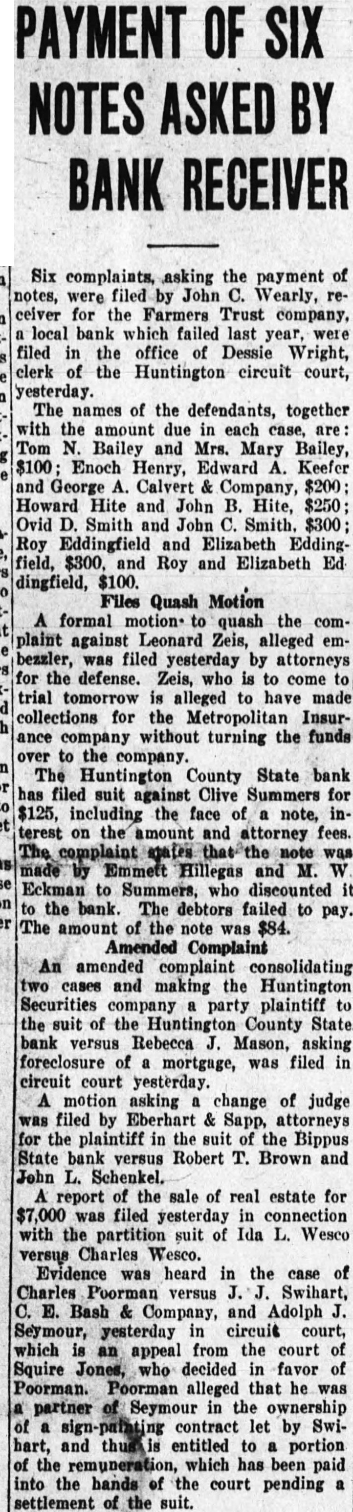 Six complaints, asking the payment of were filed John Wearly, ceiver for Farmers Trust company. local bank failed last filed office Dessie Wright, clerk Huntington circuit court, yesterday. names of the defendants, together with the amount due in each case, Bailey and Mrs. Mary Bailey, Enoch Henry, Edward Keefer George Calvert Company, $200 Howard Hite and John Hite, Ovid Smith and John Smith. $300; Roy Eddingfield Elizabeth field, and Roy and Elizabeth Ed dingfield, $100. Files Quash Motion formal motion quash the plaint against Leonard Zeis, alleged bezzler, was filed yesterday by attorneys the defense. Zeis, who come tomorrow alleged made collections for the Insurance without turning the funds to The Huntington County State bank filed Clive Summers for $125, including the face note, terest on the amount and attorney fees. complaint Hillegas M. Eckman to discounted the bank. The debtors failed to pay. The amount of the was Amended Complaint An amended complaint consolidating making the Huntington Securities plaintiff the suit of the Huntington County State. Mason, asking foreclosure mortgage, was filed circuit yesterday. motion asking change of judge was filed by Eberhart Sapp, for the plaintiff the suit the Bippus State versus Robert T. Brown and John Schenkel. report of the sale of real estate for filed with the partition suit of Ida Wesco versus Charles Evidence was heard in the case Charles versus Swihart, Company, and Adolph Seymour, yesterday circuit court, which appeal from court Squire Jones, decided favor Poorman. Poorman alleged he was partner Seymour in the contract let by Swiand entitled portion the remuneration, which has been the hands court pending settlement of the suit. PAYMENT OF SIX NOTES ASKED BANK RECEIVER
