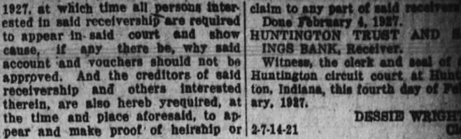 1927. at which time all persons inter- claim to of said any part ested in said receivership are required Done February 4,1927 to appear in said court and show HUNTINGTON TRUST AND cause, if any there be, why said INGS BANK, Receiver. account and vouchers should not be Witness, the clerk and seal approved. And the creditors of said Huntington circuit court receivership and others interested ton, Indiana, this fourth day therein, are also hereb yrequired, at ary, 1927. the time and place aforesaid, to an- DESSIE WRIGHT pear and make proof of heirship or 2-7-14-21