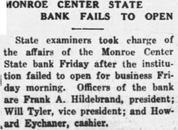 MONROE CENTER STATE BANK FAILS TO State examiners took charge of the affairs of the Monroe Center State bank Friday after the institufailed to open for business morning. Officers of the bank Frank Hildebrand, vice president; and HowEychaner, cashier.