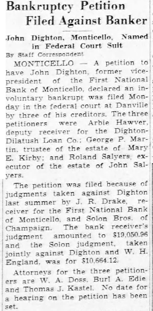 Bankruptcy Petition Filed Against Banker Dighton, Monticello, Named John Federal Court Suit Staff Correspondent MONTICELLO petition John former viceof the First National president Bank Monticello, voluntary bankrupt was filed Monday in the federal court Danville three of his creditors. were Arbie petitioners receiver for the Dightondeputy Dilatush Loan Co.: George Marof the estate of Mary tin. trustee Kirby: and Roland the of John Salecutor of estate The petition was filed because of taken against Dighton judgments last by ceiver for First National Bank and Solon Bros. of The bank receiver's amounted to $19,050.96 judgment and Solon judgment, taken Dighton W. jointly against England. for Attorneys for the three petitionW. Doss. Burl Edie Kastel No date for and Thomas the petition has hearing on