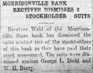 Morrisonville State Bank Receiver Sues Directors TAYLORVILLE-R. F. Wahl. receiver for the Morrisonville State bank. through his attorney Leal W. Reese filed suit Thursday in the circuit court against the directors of the bank charging them with excess loans in the sum of $100,000. DIES IN SPRINGFIELD Luella Landon. a former resident of Clinton. died Friday. in her home in Springfield, of pneumonia. She was a sister of the late Mrs. H. B. Remington of Clinton. whose hubsand was formerly manager of the Blue Valley creamtry The funeral was held in Spring-