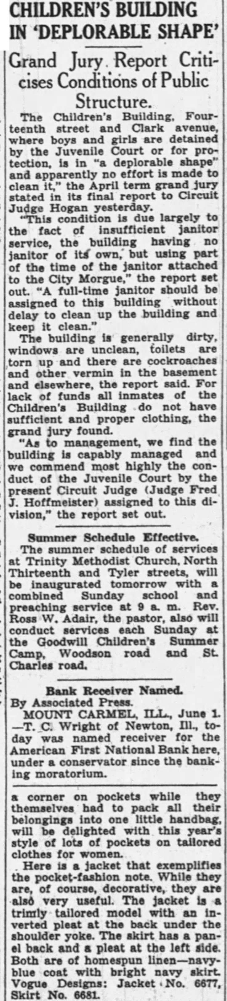 Grand Jury Report Criticises Conditions of Public Structure. The Children's Building, Fourteenth street and Clark avenue, where boys and girls are detained by the Court or for protection, is in deplorable shape" and no effort made to clean the April term grand jury stated in final report to Circuit Judge Hogan yesterday. "This condition due largely to the fact of insufficient janitor service, the building having no janitor of its own, but using part of the time of the janitor attached the City Morgue,' the report set out. "A full-time janitor should be assigned to this building without delay to clean up the building and keep clean." The building is generally dirty, windows unclean, toilets are torn and there are cockroaches and other vermin in the the report said. For lack of funds inmates of the Children's Building do not have sufficient and proper clothing, the grand jury found. "As we find the building is capably and we most highly the conduct of the Juvenile Court by the Circuit Judge (Judge Hoffmeister) assigned to this division," the report set out.