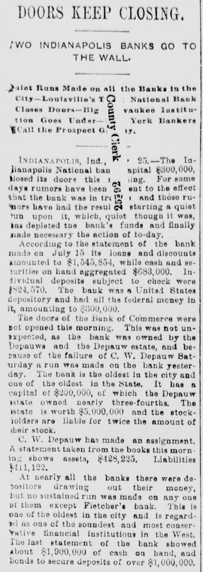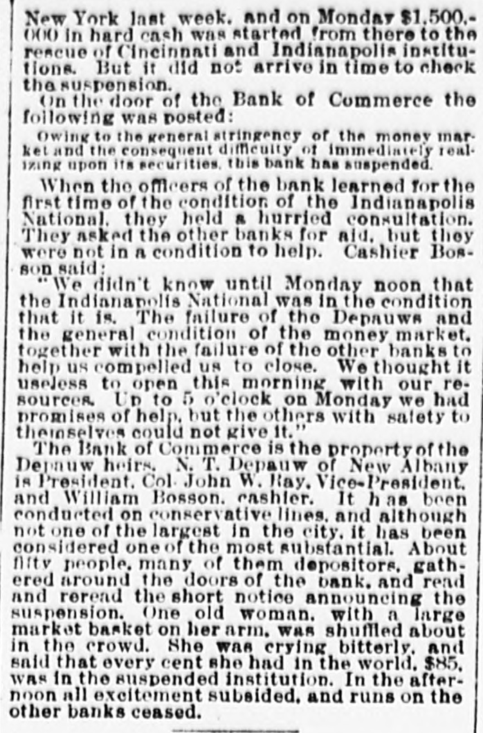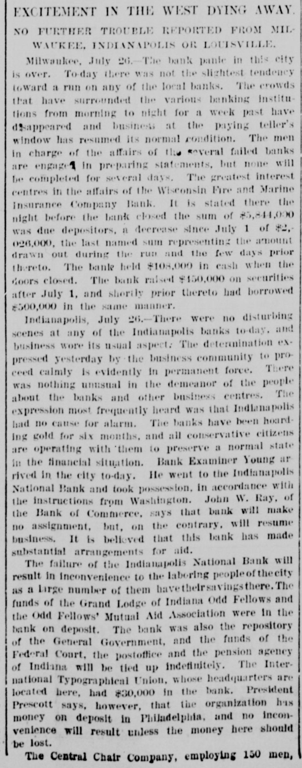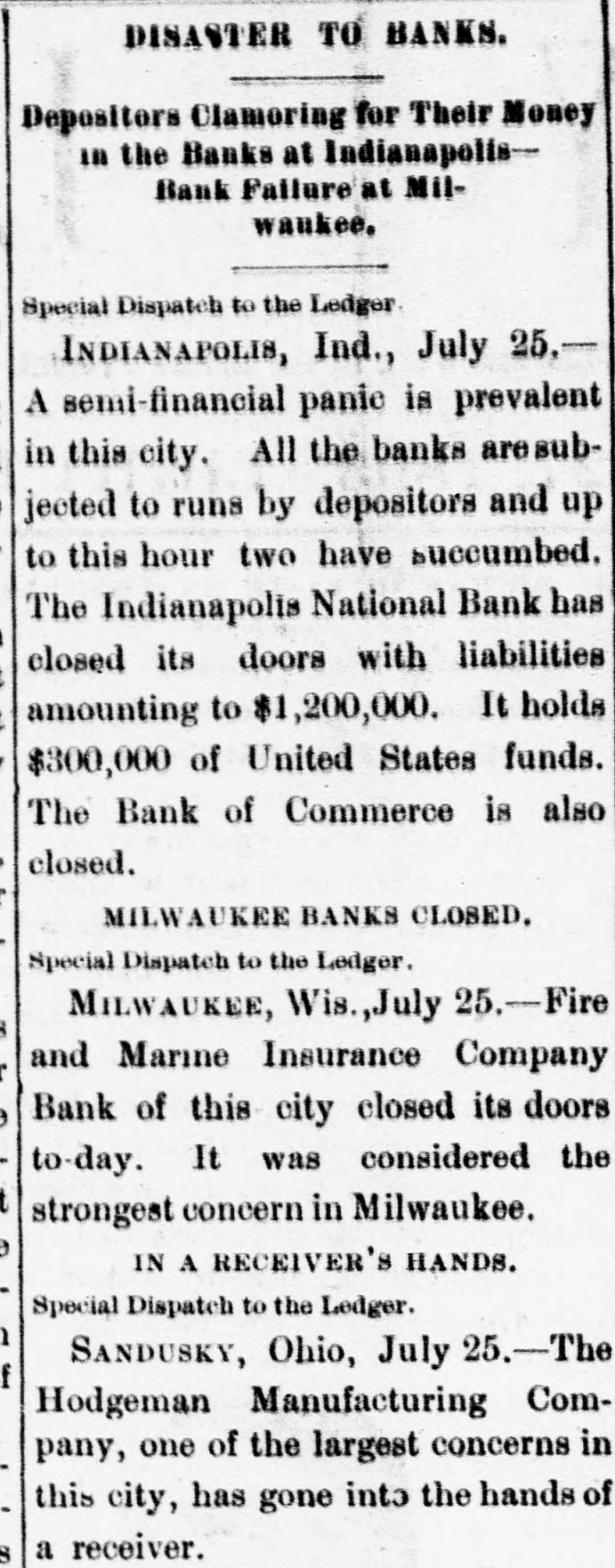 HARDTIMES COMEAGAIN TOO LITTLE MONEY CAUSES SEV. ERAL BANK FAILURES. The Capital of Indianapolis and the Colume bia of Chicago Suspend Failure Also at Wilmington. INDIANAPOLIS IND., May 11.-The Capital National Bank, of this city, has suspended. The statement is made that the closing of the bank's doors was made necessary by the failure of the Chemical National Bank of Chicago last week, which institution owed the Capital $100,000. The bank also carried a large amount of Premier Steel Works paper. The latter concern was Placed in the hands of a receiver on Friday last. The bank opened, as usual, at 9 o'clock, but it was simply opened, pending an attempt to meet a run on it from depositors, with assistance of other banks The Capital was not a member of the Clearing-House Association, and has been at war with it. When the other banks were asked for assistance, they met and declined to render any. The doors of the Capital were then at once closed by order of the directors. The first public intimation of the failure was the placard pasted on the window. and the excitement for a time was intense. A number of people withdrew their deposits from other banks. The Bank of Commerce had quite a run. It is controlled by the Depaus, who were the controllers of the Premier Steel Works, now in the hands of a receiver. Some of the paper of the Steel Company was held by the Capital Bank. The Bank of Commerce was prepared for all emergencles. and confidence was soon restored. The actual liabilities of the Capital are about $1,050,000. The paid up capital stock is $300,000. and the assets are estimated at $250,000. M. B. Wilson was president, and Charles B. Doherty cashier. The failure may endanger the solvency of banks at Vincennes, Sullivan and Gas City, in which Wilson, Doherty and others are large stockholders, and between which and the Capital intimate relations existed. The Comptroller of the Currency has telegraphed that a special agent is on his way to take charge of the bank. It is believed that the Capital will pay 100 cents on the dollar. Wilmington Bankers Suspend. WILMINGTON DEL. May 11-The annourcement of the failure of R. R. Robinson & Co., bankers and brokers of this city, to-day created a profound sensation. Rumors of the failure of this well-known firm have been on the street for several days, and business circles have been excited. The liabilities of the firm are estimated at $300,000. while the assets do not exceed $100,000. The sheriff has seized all the property of the bankrupt firm. Another Chicago Bank Fails. CHICAGO, ILL., May --The Columbia National Bank of this city has failed. In a report of the bank's condition, made by its officers at the close of business May 4th, the deposits were stated to be nearly one and a half million dollars. The capital stock of the bank is $1,000,000. The failure was due to unprecedented withdrawals of deposits during the past two weeks, amounting to nearly half a million dollars Yesterday a demand for $100,000 was made by a customer. The demand was met, but it so impaired the condition of the bank that it was decided to seek the aid of other institutions today. This was done this morning, but rival banks were not inclined to give temporary aid till an examination of the bank's affairs had been made. At 11 o'clock it was decided to announce the failure of the institution, and a notice to that effect was posted on its doors. Insignificant London Failure. LONDON, May 11.-Hallett & Company, navy agents and bankers, have suspended. The suspension has caused a sensation in military and naval circles at the West End, as many officers are depositors with the company, but commercially the failure is of slight importance. The members of the firm are James Alfred Hallett, William Charles Hallett and Milford Hallett, and their place of business Is 7 St. Martin's Place, W. C.