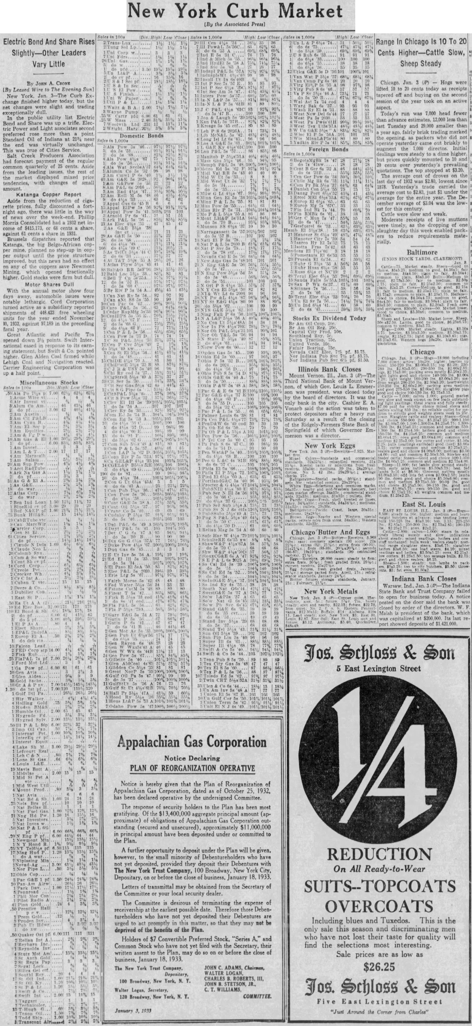 High Low Close Sales in High Close High Range In Chicago Is 10 To 20 Cents Higher-Cattle Slow, Sheep Steady G&E 100% Chicago, Jan. 3 (AP) Hogs were lifted 10 to 20 cents today as receipts tapered off and buying on the second session of the year took on an active aspect. Today's run was 7,000 head fewer Mass than advance estimates, 12,000 less than last Tuesday and 29,000 smaller than Wright Harg a year ago, fairly brisk trading marked Domestic Bonds the opening. as packers who did not operate yesterday came out briskly to Ala Pow Foreign Bonds augment the 7,000 directos. Initial dealings were steady to dime higher. but prices quickly mounted to 10 and 20 cents over yesterday's prevailing Wat quotations. The top stopped at $3.20. Am The average cost of droves on the last day of 1932 was $2.80, lowest since 1878. Yesterday's trade carried the average cost to $2.83, just $1 under the average for the entire year. The December average of $3.04 was the lowest for this century Arnold Cattle were slow and weak. Moderate receipts of live muttons As were timely, as the dropping of one 38 slaughter day this week enabled packers to reduce requirements materially. Baltimore (UNION STOCK YARDS. CLAREMONT) Atlas Market Bal Riv Stocks Ex Dividend Today 10c. Southland Mount Vernon. Ill., Jan. (P)-The Third National Bank of Mount VerMiscellaneous Stocks non, of which Gov. Louis L. EmmerSales 7.00 son was president, was closed today Wire by the board of directors. It was the Air only bank in the city. Cashier E. A. Vonarb said the action was taken to protect depositors after a heavy run Saturday as result of the closing the Ridgely Farmers State Bank Springfield of which Governor Emmerson was director. Jan. Ben firm graded January storage January January Indiana Bank Closes Warsaw, Ind., Jan. (P)-The Indiana Decre State Bank and Trust Company failed to open for business today. A notice posted on the door said the bank was closed by order of the directors. W. Maish is president of the bank. which was capitalized at 000. Its last report showed deposits of $1,421,000. Lead Jos. Schloss & Son 5 East Lexington Street Interst Equit Appalachian Gas Corporation Lefcourt Real Lone Notice Declaring Louis Mavis Bott PLAN OF REORGANIZATION OPERATIVE 2.00 1 Mid Pet West Notice is hereby given that the Plan of Reorganization of Mid Mount Appalachian Gas Corporation, dated as of October 25, 1932, has been declared operative by the undersigned Committee. The response of security holders to the Plan has been most 00 gratifying. Of the $13,400,000 aggregate principal amount (approximate) of obligations of Appalachian Gas Corporation outInves standing (secured and unsecured), approximately $11,000,000 in principal amount have been deposited under or committed to Eng the Plan. Hond A further opportunity to deposit under the Plan will be given, Hud REDUCTION however, to the small minority of Debentureholders who have Min not yet deposited. provided they deposit their Debentures with Pipe On All Ready-to-Wear The New York Trust Company, 100 Broadway, New York City, Depositary, on or before the close of business, January 18. 1933. Pae 50 Letters of transmittal may be obtained from the Secretary of SUITS-TOPCOATS the Committee or your local security dealer. The Committee is desirous of terminating the expense of OVERCOATS Prentice Hall receivership at the earliest possible date. Therefore those Deben12 tureholders who have not yet deposited their Debentures are Including blues and Tuxedos. This is the urged to act promptly in this matter, so that they may not be deprived of the benefits of the Plan. only sale this season and discriminating men who have not lost their taste for quality will Int Holders of $7 Convertible Preferred Stock, "Series A," and Common Stock who have not yet filed with the Secretary, their find the selections most interesting. written assent to the Plan, may do so on or before the close of Sale prices are as low as business, January 18, 1933. Regis JOHN C. ADAMS, Chairman, $26.25 The New York Trust Company, WALTER LOGAN Depositary, CHARLES B. ROBERTS, III, 100 Broadway, New York, N. Y. JOHN STETSON, JR., Jos. Schloss & Son Walter Logan, Secretary, 120 Broadway, New York, N. Y. COMMITTEE. Five East Street January 1933 "Just Around the Corner from Charles"