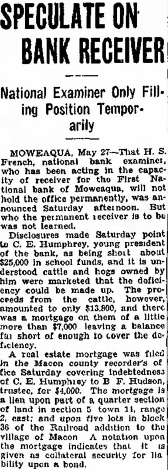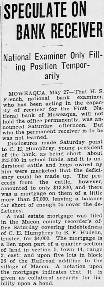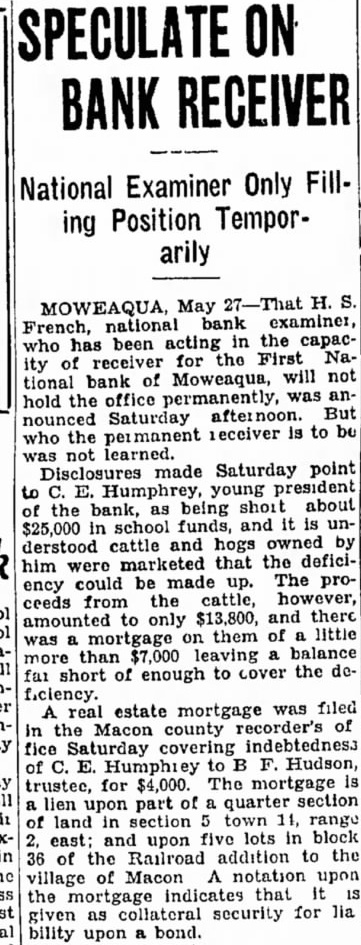 SPECULATE BANK RECEIVER National Examiner Only Filling Position Temporarily May French, national bank examiner, who has been acting in the capacity of receiver for the First tional bank of Moweaqua, will not hold the office permanently, was nounced Saturday afternoon. who the permanent receiver to not learned. Disclosures made Saturday point E. Humphrey. young president the bank, as being short about $25,000 school funds, and is understood cattle hogs owned him were marketed that the could be made up. The ency ceeds from the cattle, however, amounted to only $13,800, and there mortgage them of little more than $7,000 leaving balance far short of enough to cover the real estate mortgage was filed the Macon county of covering indebtedness Hudson, trustee, for The mortgage lien upon part of quarter section land in section town and five lots in block upon 36 of the Railroad addition to the village of Macon notation upon the mortgage indicates that given collateral security for lia bility upon bond.